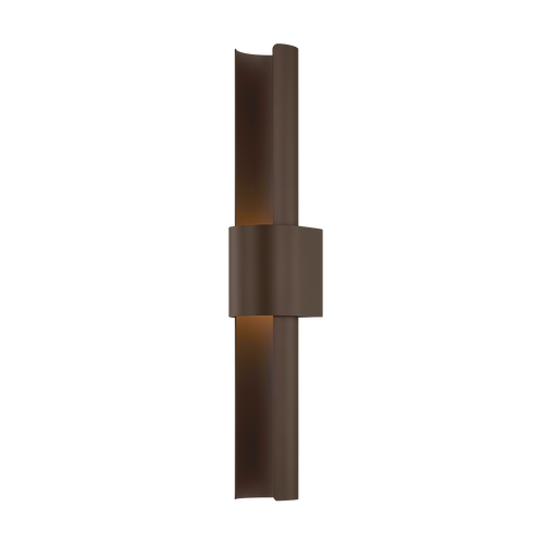 An industrial-modern sconce with graphic appeal, Ossian combines smooth curves and an allover Bronze materiality to create an edgy exterior staple. Its tubular shape creates a unique C-shaped channel that is intersected by a wide belt at the center, concealing the light source. As the channel fills with light, this graphic sconce casts an ambient glow around an outside area.