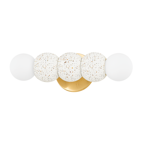 A pair of glass globes are set at opposite ends of a trio of White Terrazzo spheres to give this modern wall sconce an artful yet unexpectedly playful feel. The patterned flecks in the Terrazzo add warmth and work beautifully with the Aged Brass backplate. Paola can be mounted either vertically or horizontally, making it suitable for both smaller and larger wall spaces.