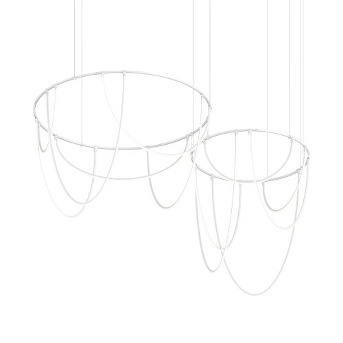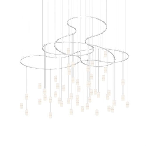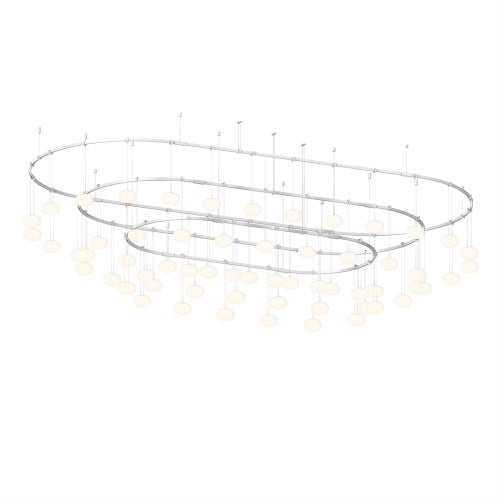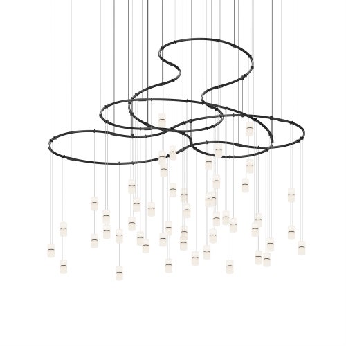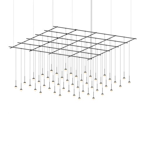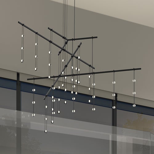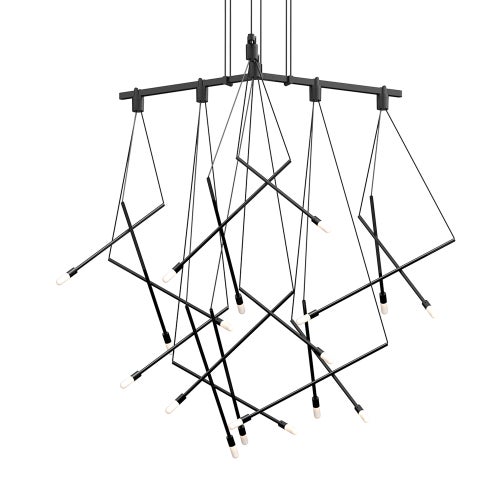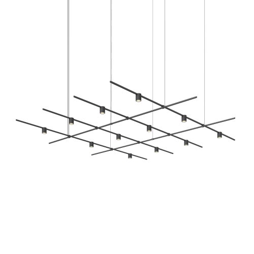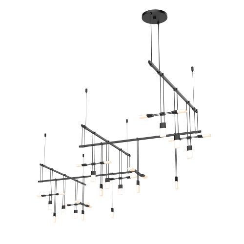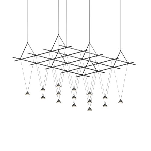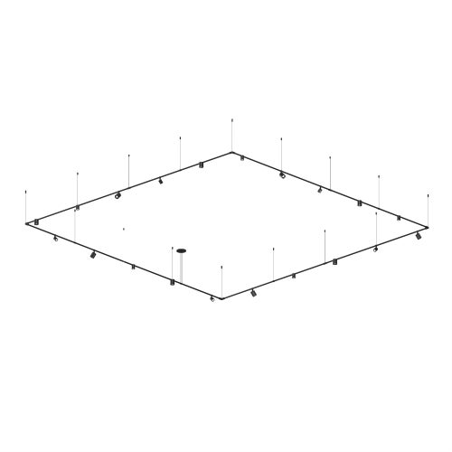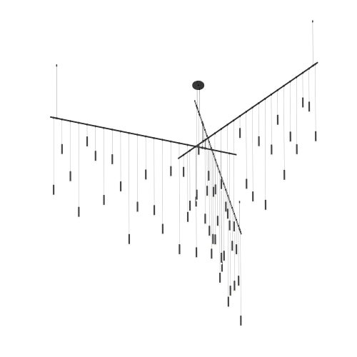 Power bars are suspended at right angles to each other, connected by perpendicular Power Bar Hangers. Zig Zag arrangements can be used to form a linear pattern, or combined and oriented to form a broad composition arrayed across the plane of an entire ceiling.