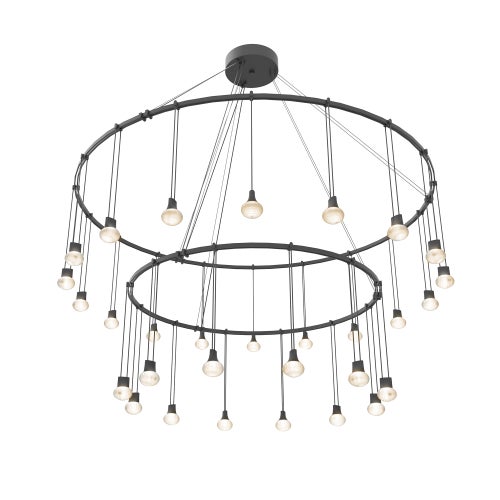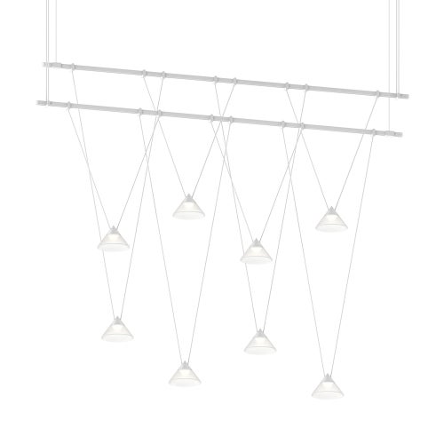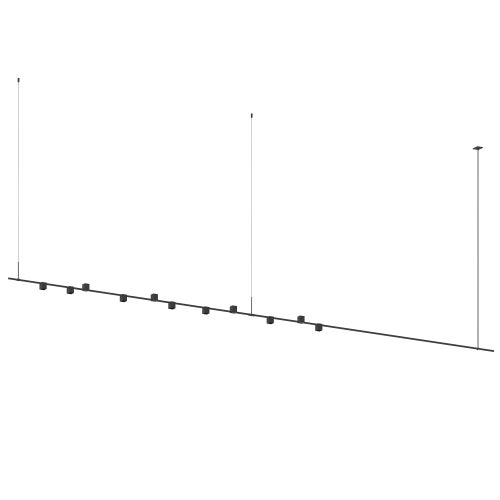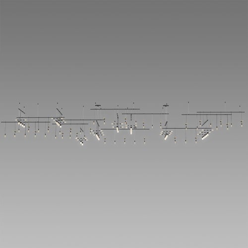 Power bars are suspended at right angles to each other, connected by perpendicular Power Bar Hangers. Zig Zag arrangements can be used to form a linear pattern, or combined and oriented to form a broad composition arrayed across the plane of an entire ceiling.