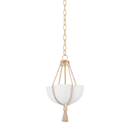Celebrating the beauty of natural materials, the sophisticated Amberley pendant features a unique natural rope suspension and ethereal opal matte glass shade. Resembling a quatrefoil shape from above, the shade has four scalloped edges that nod to its botanical underpinnings. From the ceiling, the rope cradles the shade, culminating in an elegant tassel at the bottom. A central stem finished in Vintage Gold Leaf adds to the warm tonality of Amberley.