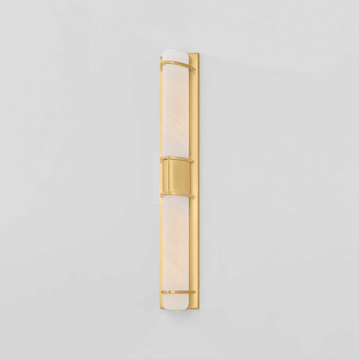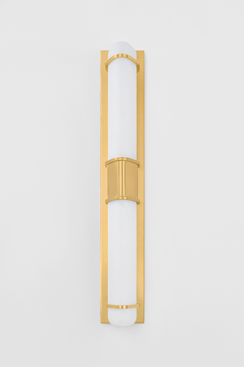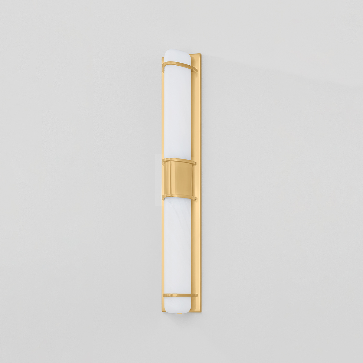 Pairing minimalist metalwork with matte cloud glass, Tottenville is a highly versatile sconce for a powder room or bath area. The glass shades feature a unique triangular profile that gives this fixture both slimness and its distinctly modern feel. Choose from a single or dual light sconce with an Aged Brass or Polished Nickel finish.
