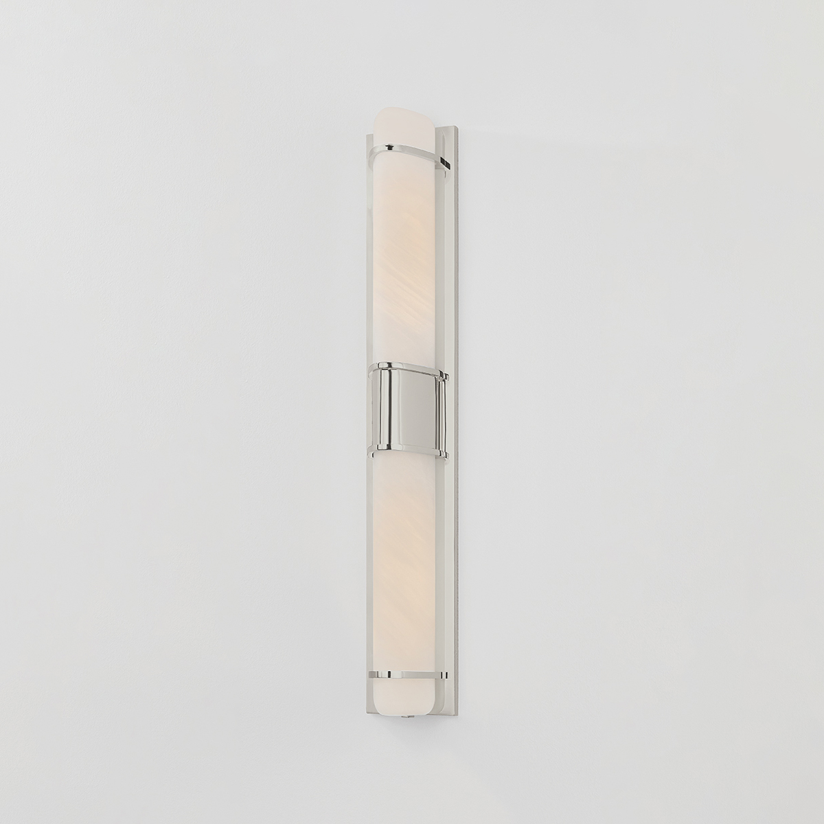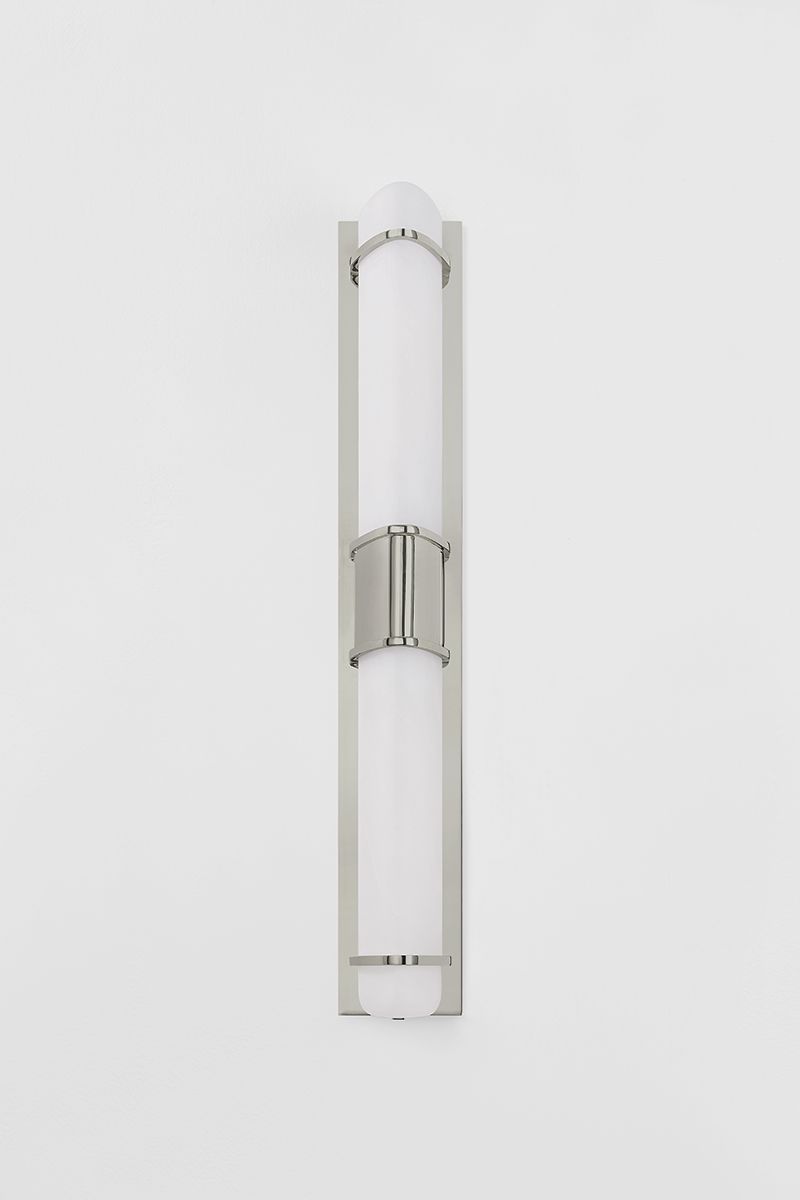 Pairing minimalist metalwork with matte cloud glass, Tottenville is a highly versatile sconce for a powder room or bath area. The glass shades feature a unique triangular profile that gives this fixture both slimness and its distinctly modern feel. Choose from a single or dual light sconce with an Aged Brass or Polished Nickel finish.