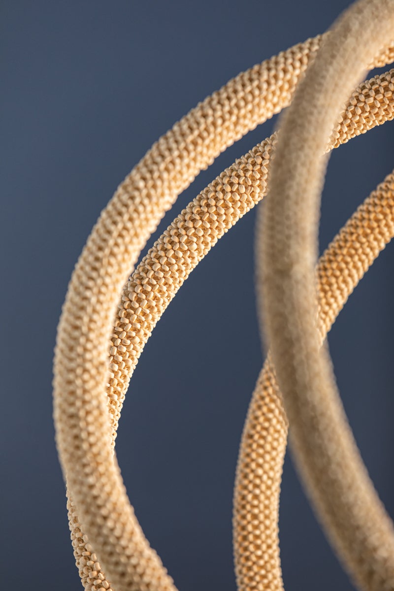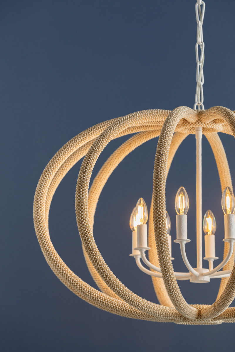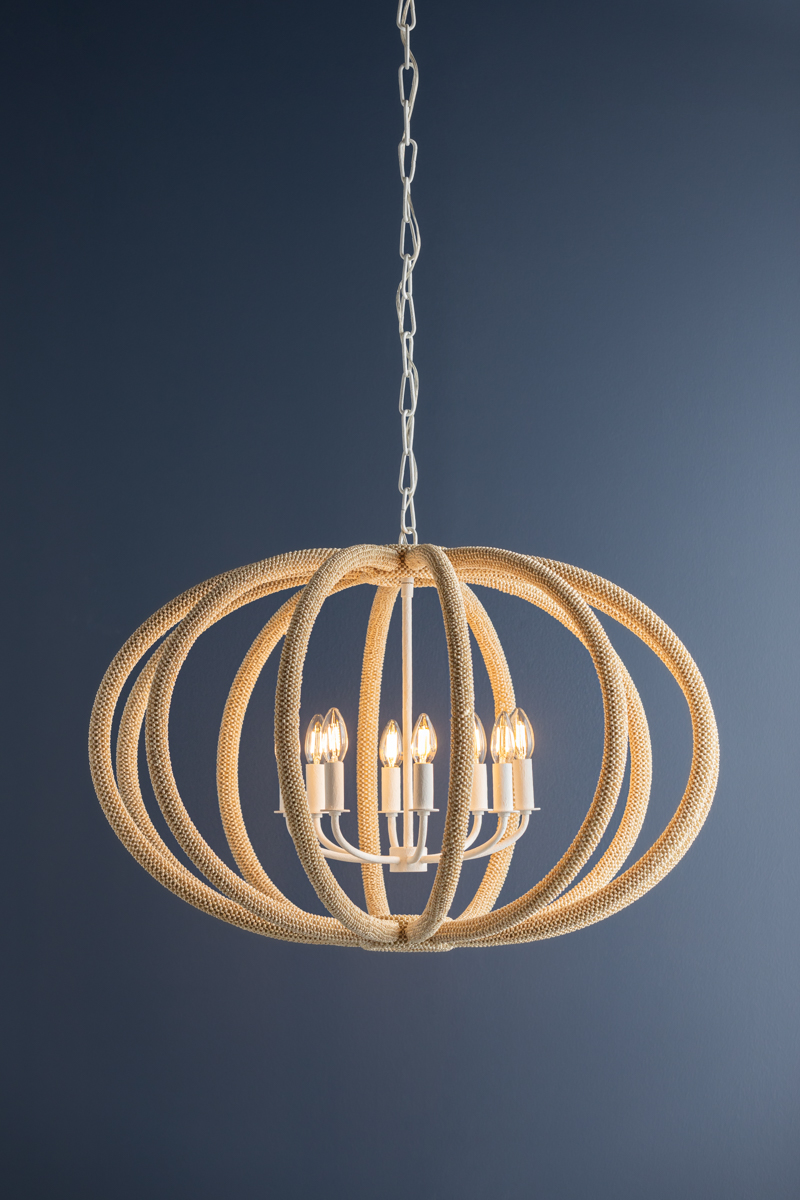 Intricately wrapped in white coconut shell beads, the enchanting Lewiston resembles an artifact pulled from the sea. Its gracefully looped arms form an oblong cage-like structure with a candle cluster nested inside. Suspended from a matching white chain, Lewiston is available in 6 and 8-light versions.