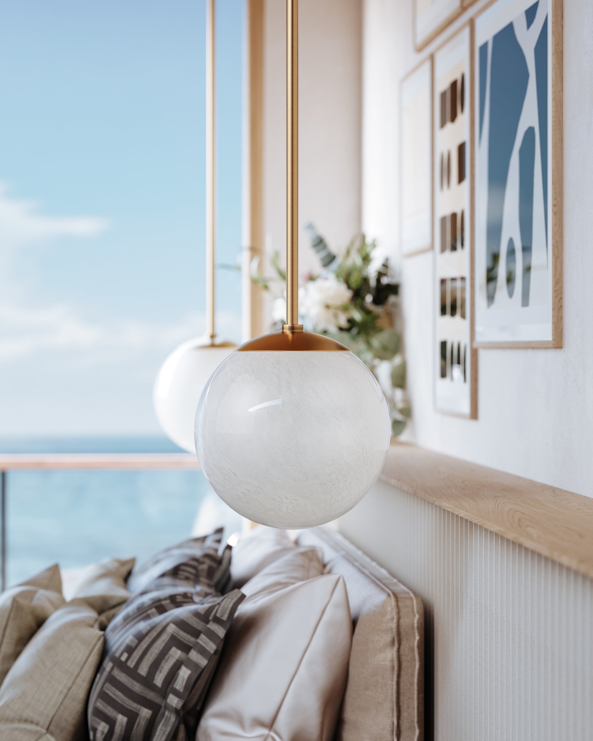 A traditional globe pendant, Burlington's difference is in the details. Like looking up at a single cloud in a clear sky, the cloud etched glass sphere is both tranquil and mesmerizing—whether lit or unlit. The dome canopy and thicker stem give this deceptively simple design that little something extra. Pendant comes in two sizes to fit any space and two finishes to match any style.