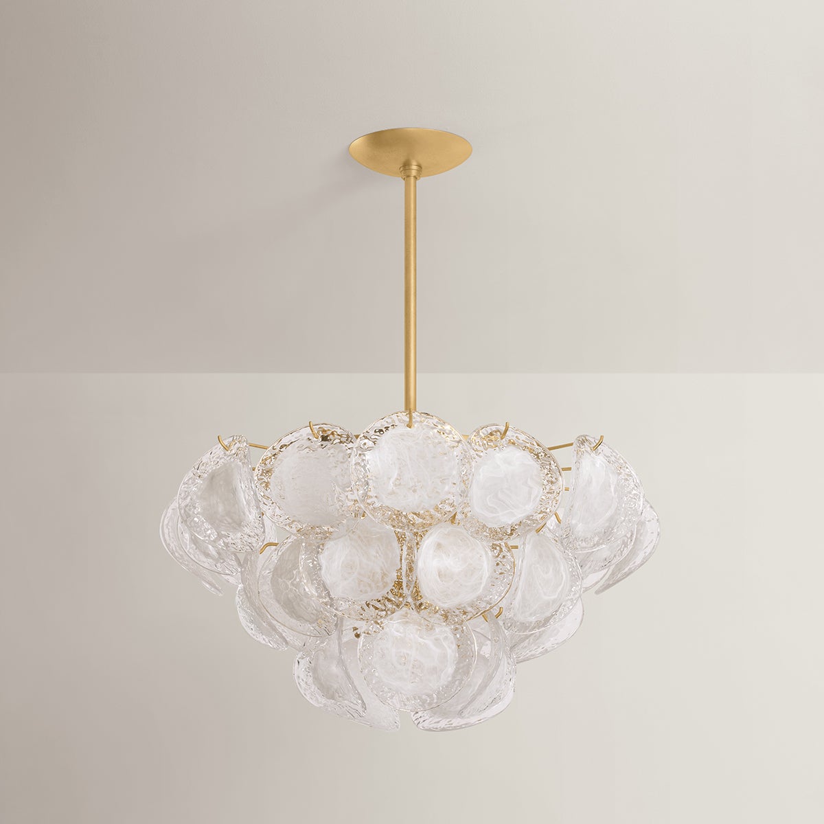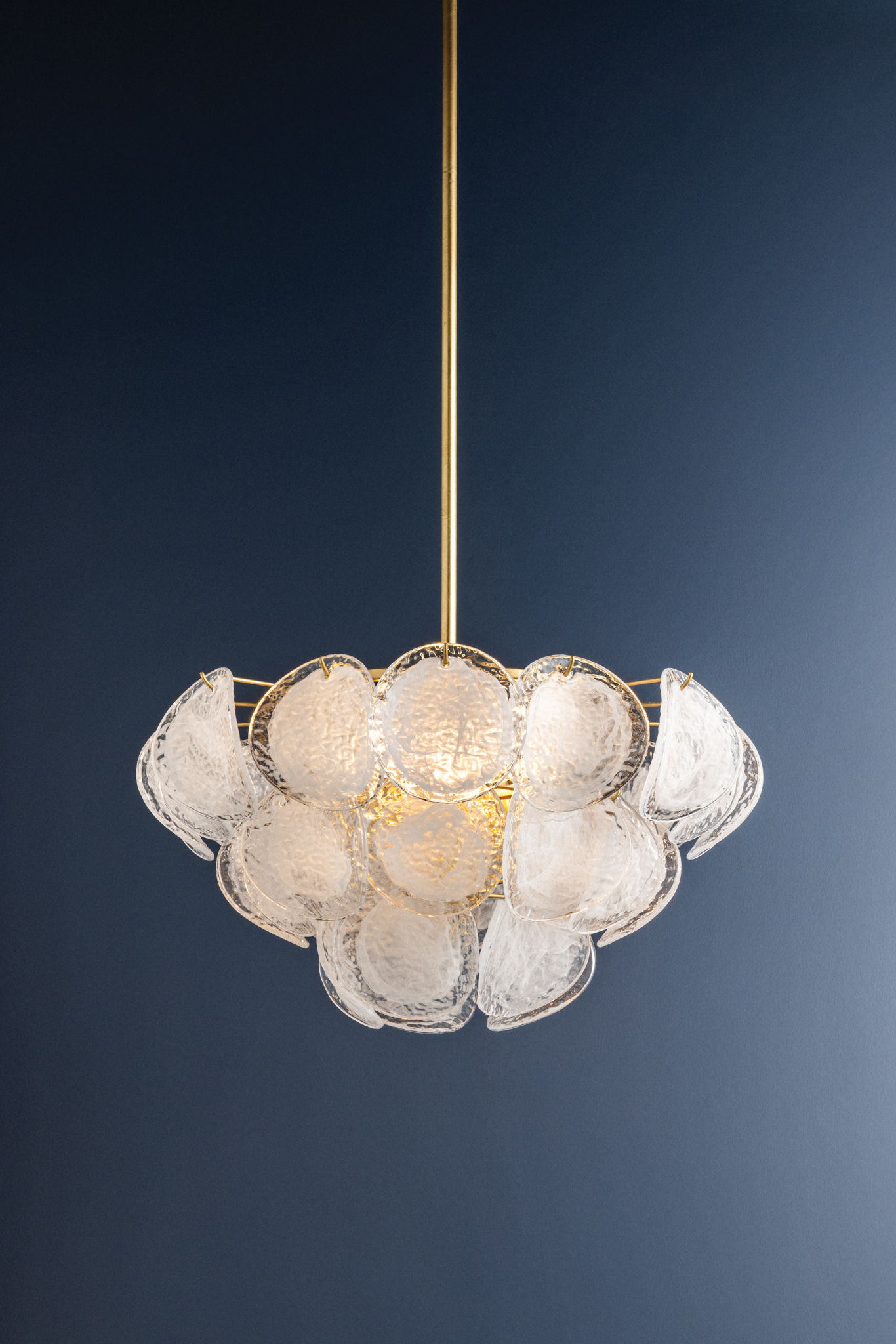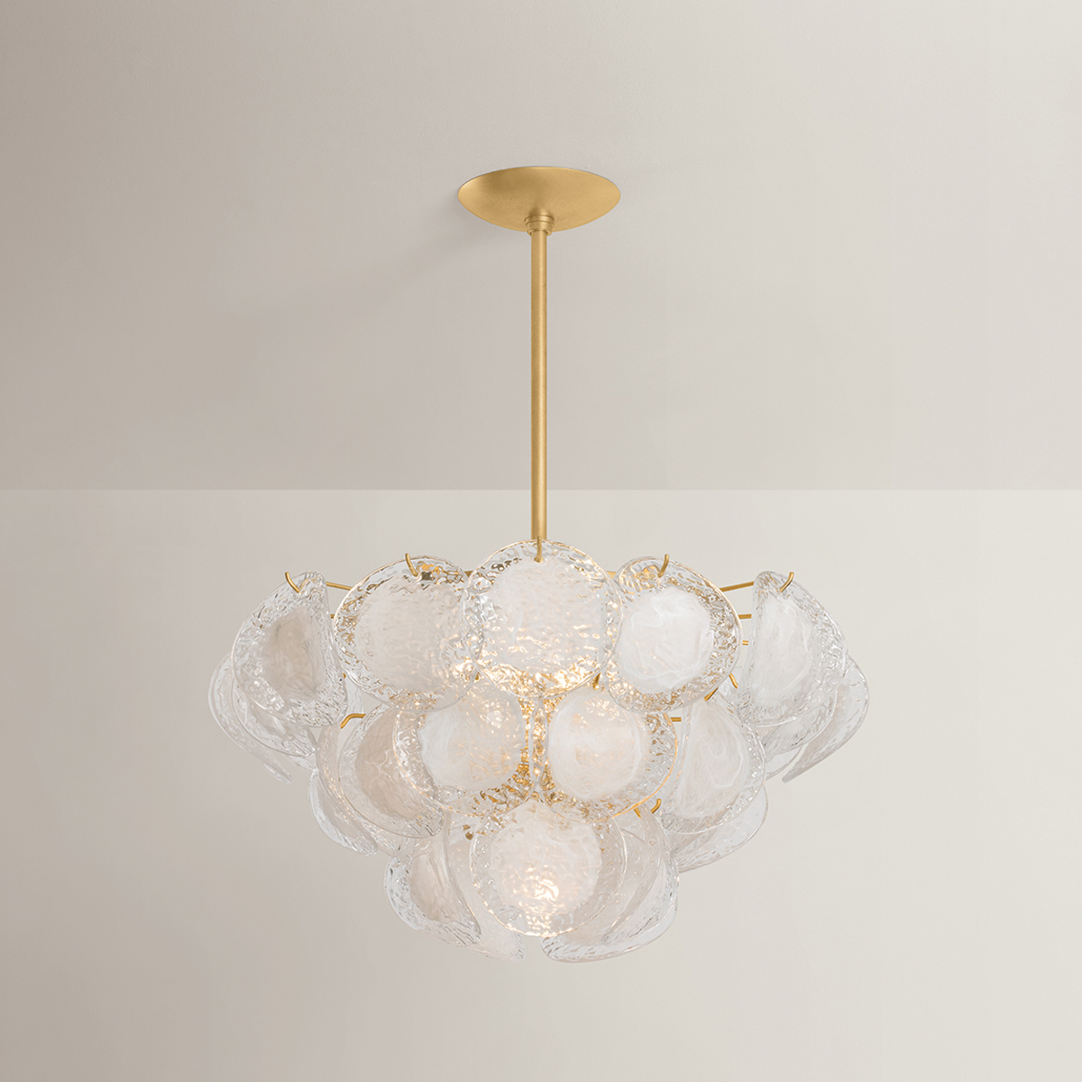 A celebration of maximalism, Cedar Hill is a whimsical tiered showpiece composed of painterly glass panels. Each suspended panel of Blonchino piastre glass curls slightly outwards, adding volume to the composition. Viewed from the side, Cedar Hill recalls a cluster of grapes on the vine; from below, it blooms like a rose. This lustrous fixture is available with 5, 9, or 17 lights with a Vintage Gold Leaf finish.