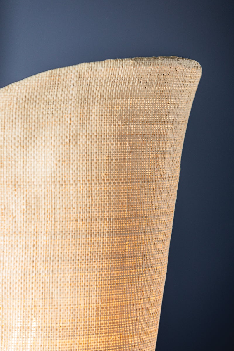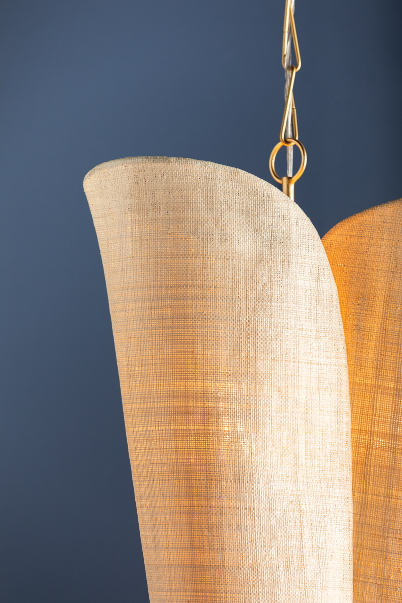 Marrying organic aesthetics with contemporary design, the raffia panels of Springhill envelop the warm, inviting light within. Curled like leaves around the light source, the tapered shade celebrates the time-honored craft and tactile qualities of the woven raffia. Suspended from a minimalist Gold Leaf chain, Springhill is a sophisticated and fresh accent pendant. Available in two sizes.