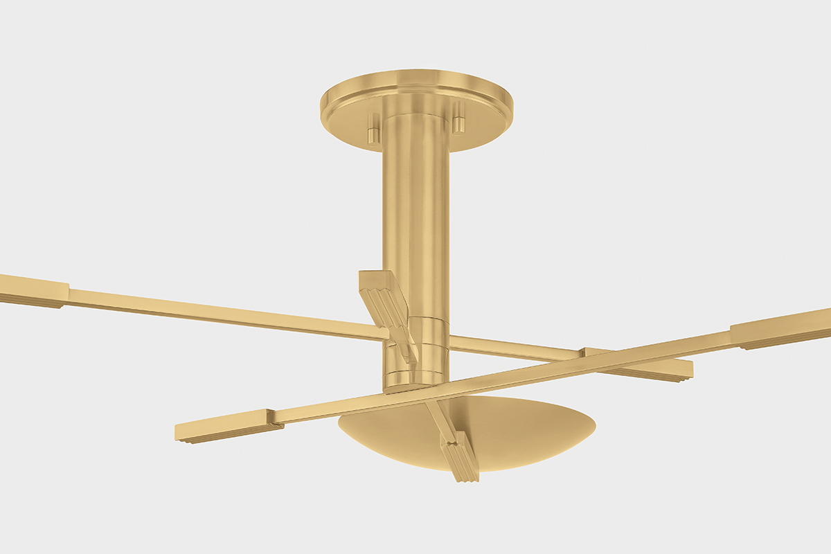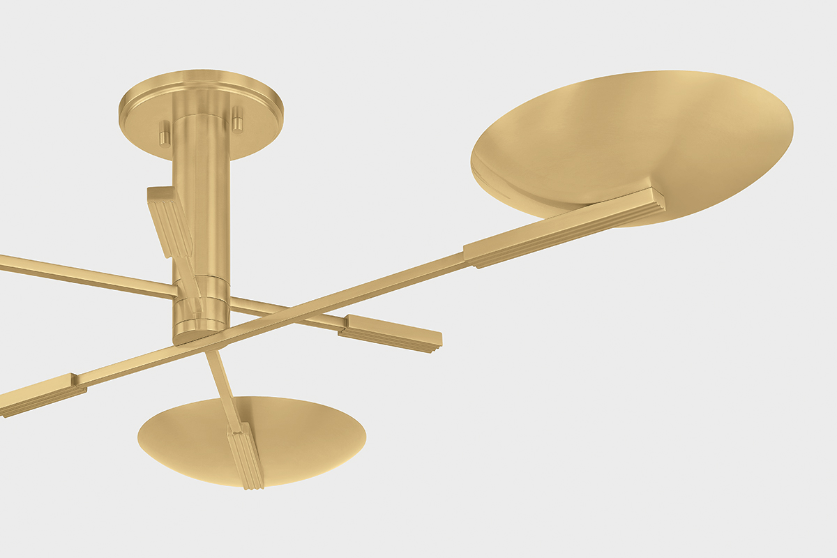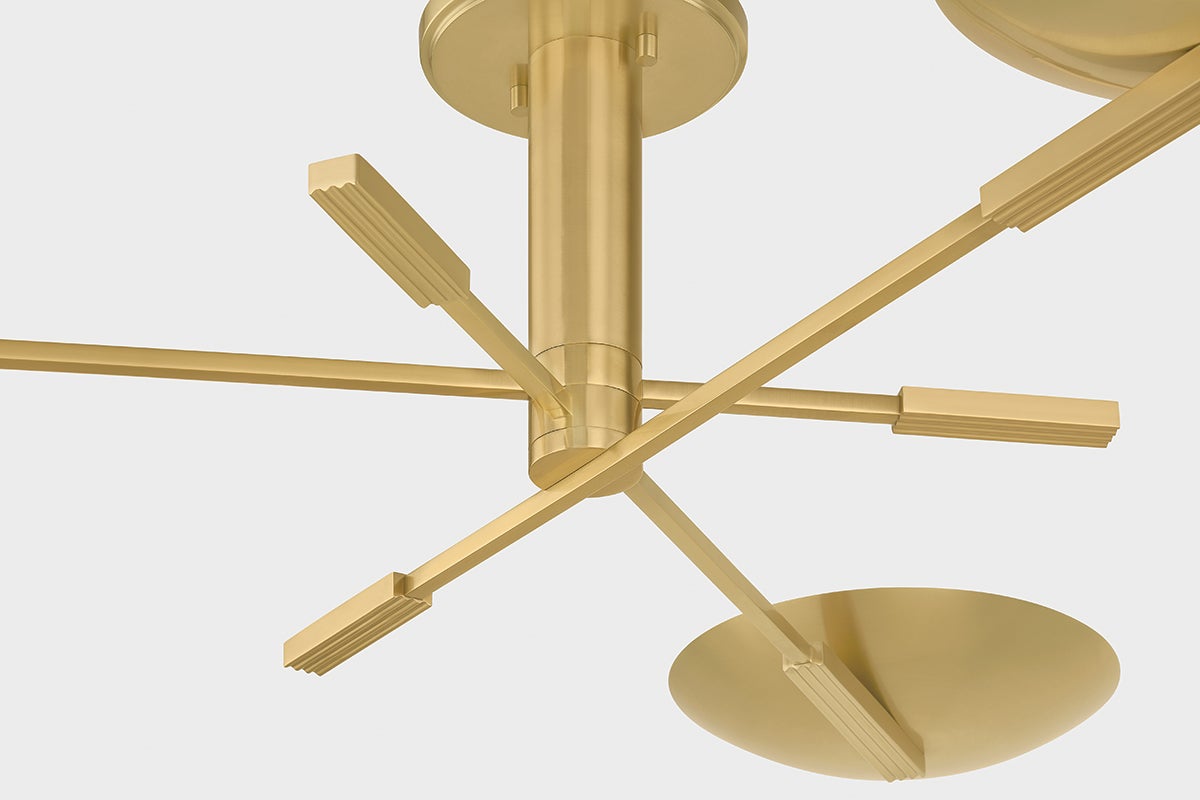 The Johnson family gives a modernist silhouette an industrial twist. Reminiscent of spokes, the slender arms of this chandelier and flush mount support shallow dome shades that direct LED light upwards. Each arm features a subtle linear knurl at the ends, while the center stem is grooved at the bottom for added texture. Finished in Aged Brass.