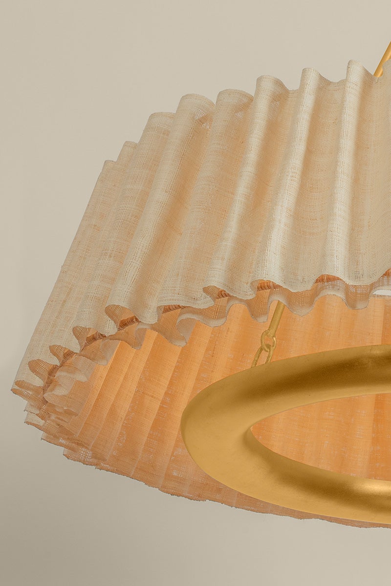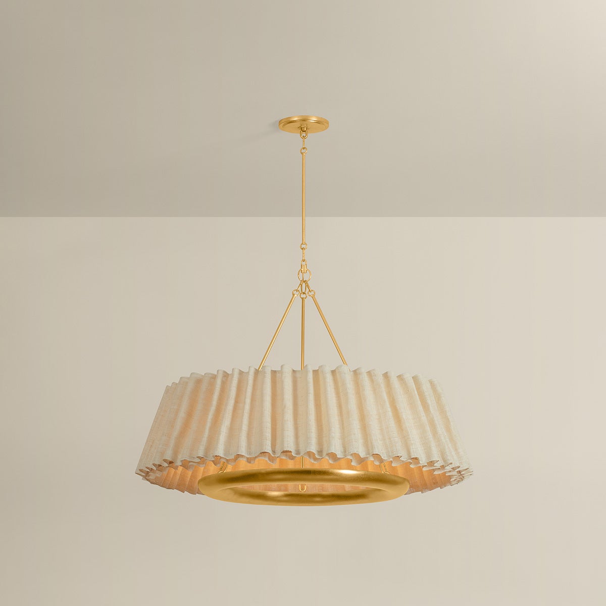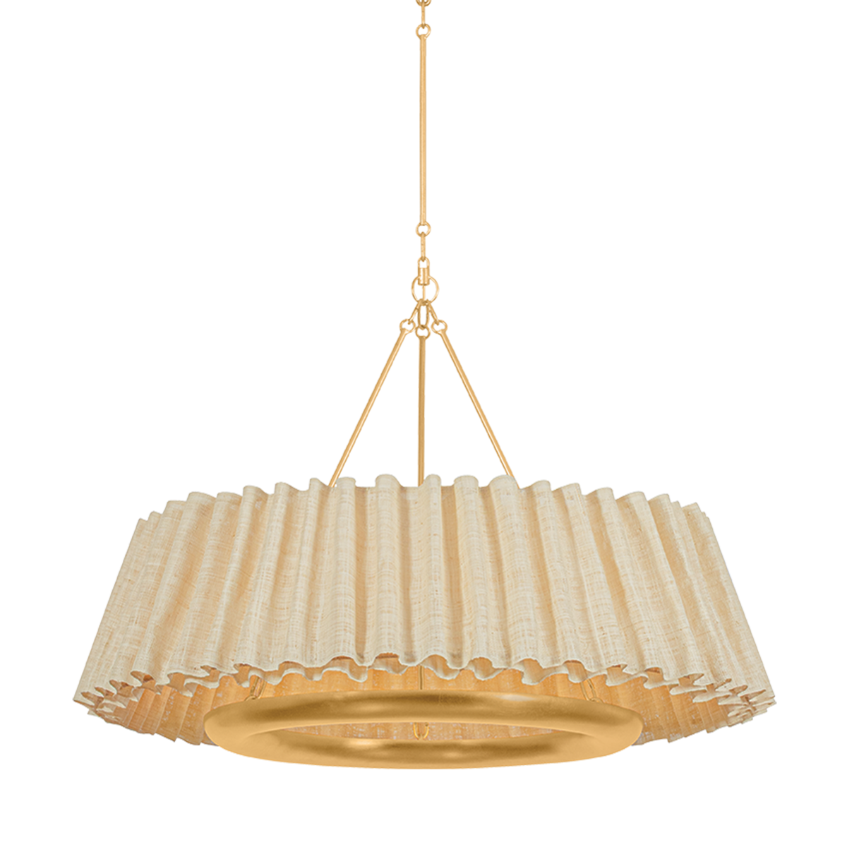 Brimming with flair, the Beechford chandelier elevates a classic ring silhouette with a loosely gathered natural raffia shade and modern LED lamping. Resembling a textural ruffle, the oversized pleated shade directs light downward through the Vintage Gold Leaf frame. Available in two sizes, Beechford’s transitional appeal provides flexibility for modern dining areas, entryways, and living rooms.