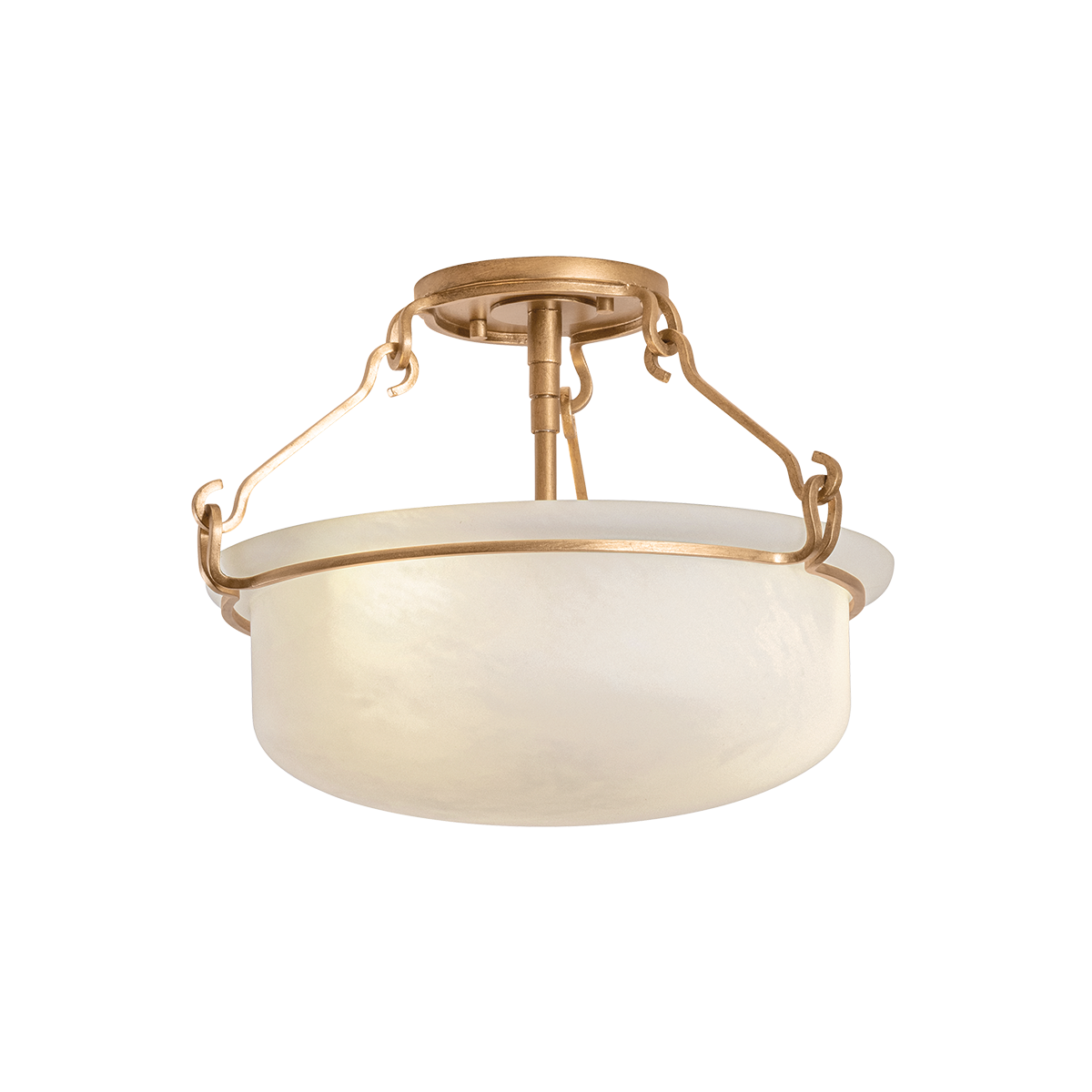 Reimagining a vintage design with looping metalwork, the Lowerre semi-flush mount brings just the right amount of style to your ceiling. A wide, low-profile shade in matte cloud glass recalls the familiar shape of an antique mason jar. Finished in Patina Gold Leaf, the oversized loop-and-hook suspension nods to the decorative swirls of the Art Nouveau era. Available in two sizes, Lowerre will set a soft ambience in a living room or hallway.