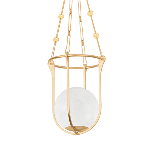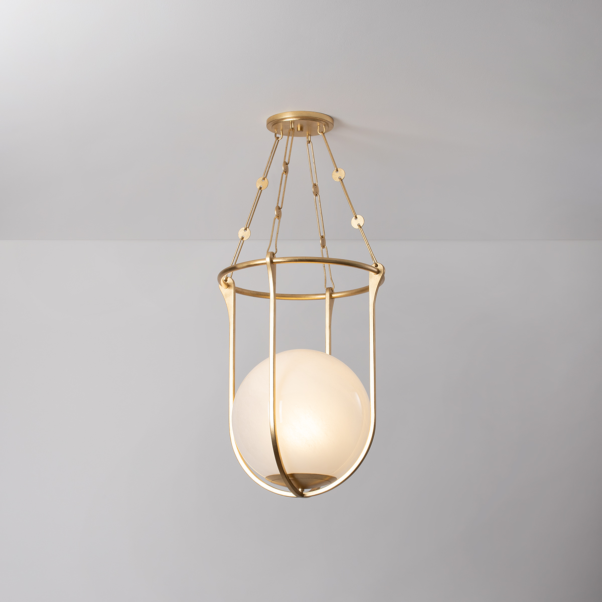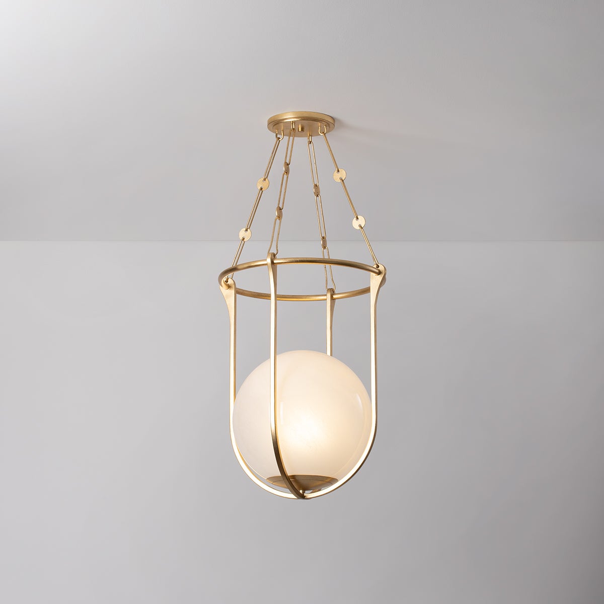 A delicate Vintage Gold Leaf cage, gracefully swirling cloud glass orb and intricate suspension chains converge to create this mesmerizing pendant light. Exhibiting a jewelry-like appearance, Verbank is enhanced by its subtle details, including circular ornaments on the chains and Art Deco-inspired curves. Like a planetary body glowing in the sky, this is a truly magical lighting experience.