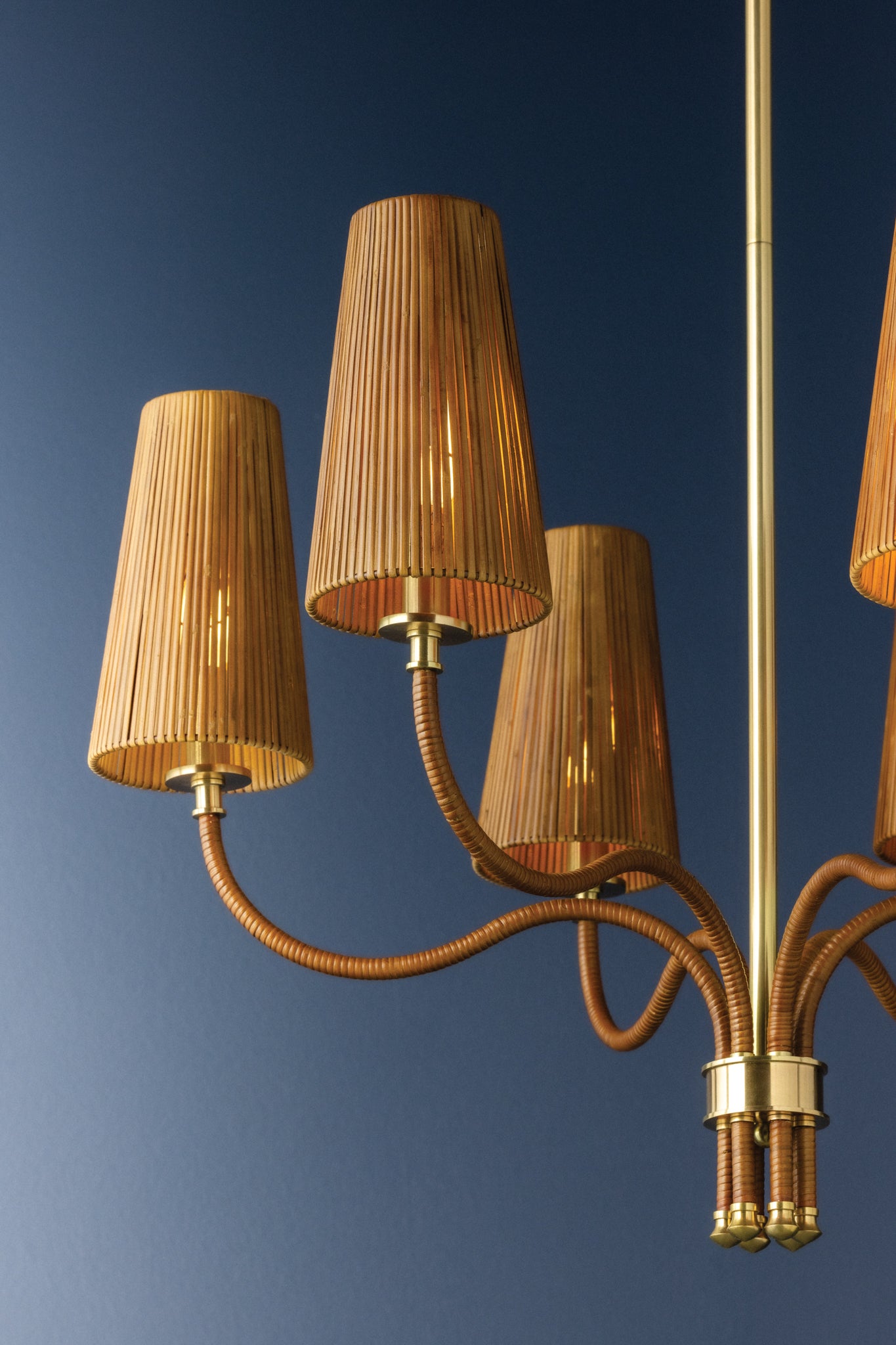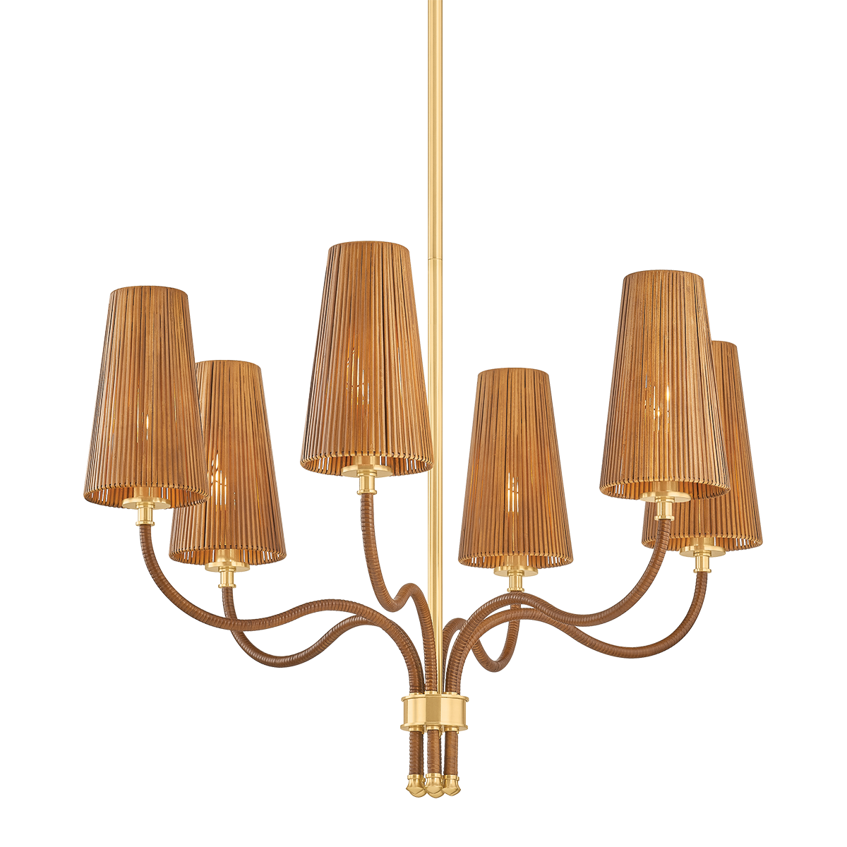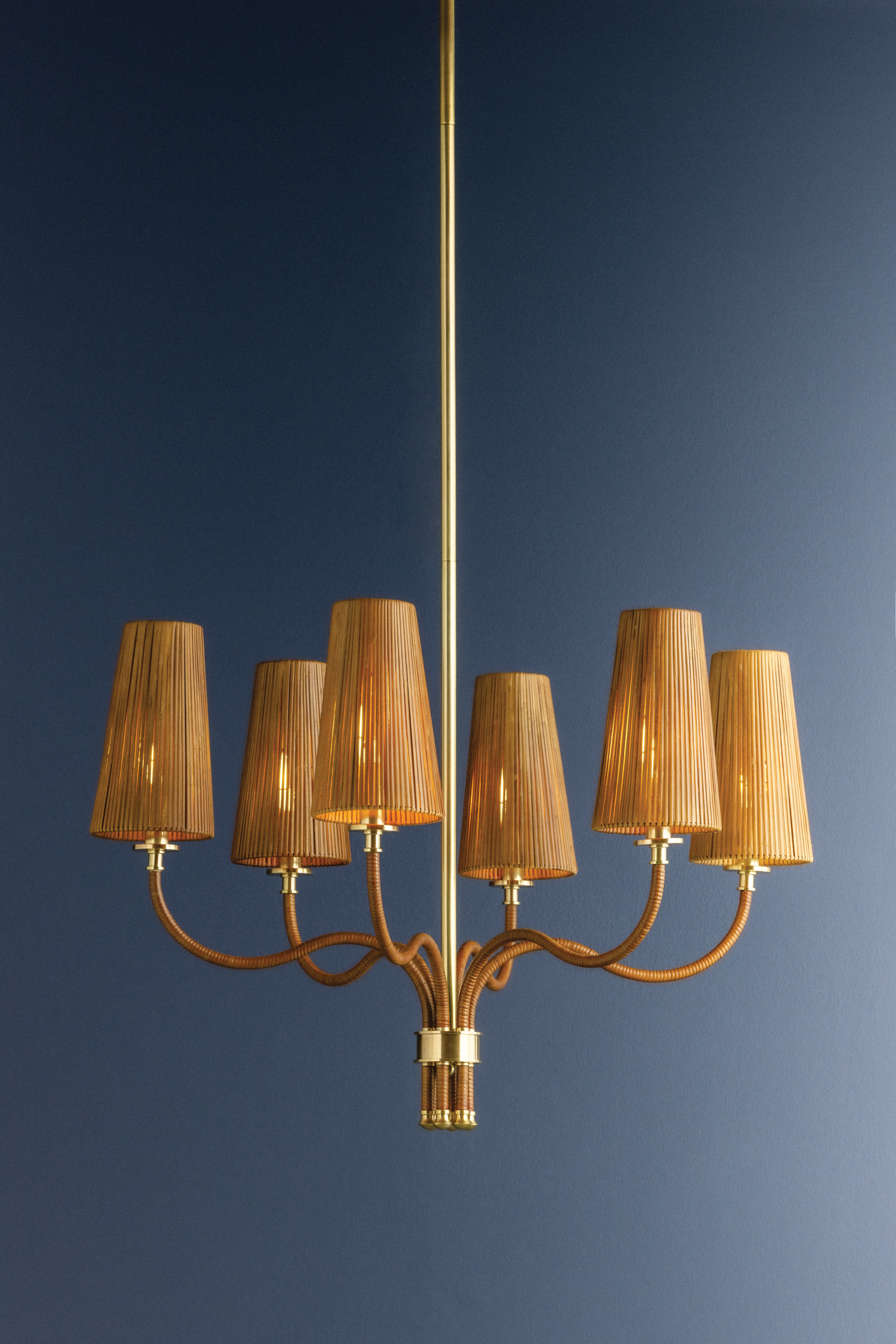 Paying homage to the sinuous creations of Finnish designer Paavo Tynell, the Atwood family uses natural materials to form striking branch-like silhouettes. Elongated arms and tapered shades are wrapped in rattan skin, creating an earthy, global statement. The metal rod, bobèches, and cuffs are finished in Aged Brass, lending a luxurious feel. Available as a 1-light sconce, 6-light chandelier, and 10-light chandelier, these pieces are designed to be layered throughout the home.