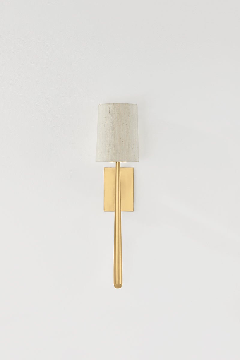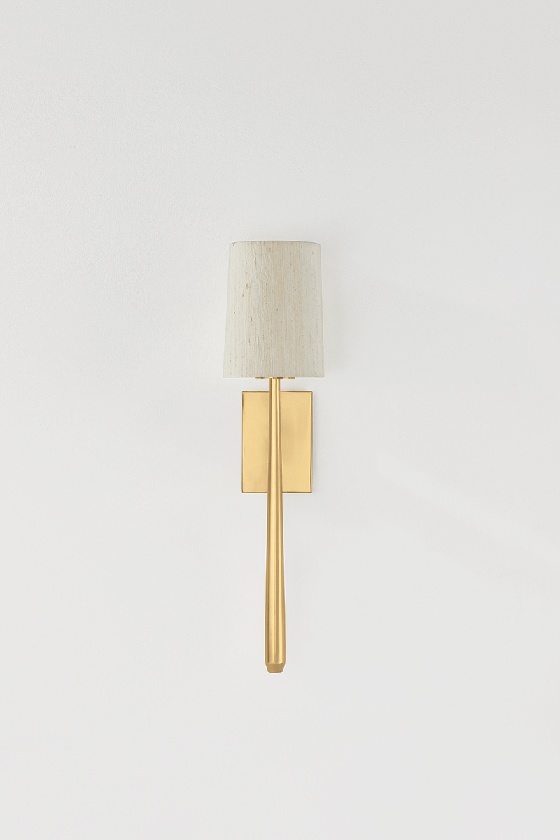 Combining soft materiality and refined form language, the Bridgeton family blends into both modern and classic interiors. Natural silk shades add depth and richness by adding texture to the framework. While the sconce is minimal and timeless, the two sizes of chandelier feature a unique twist on a ring silhouette. Finished in Aged Brass, the delicate suspension includes loops that attach to hooks on the canopy, highlighting the fine craftsmanship behind this design.