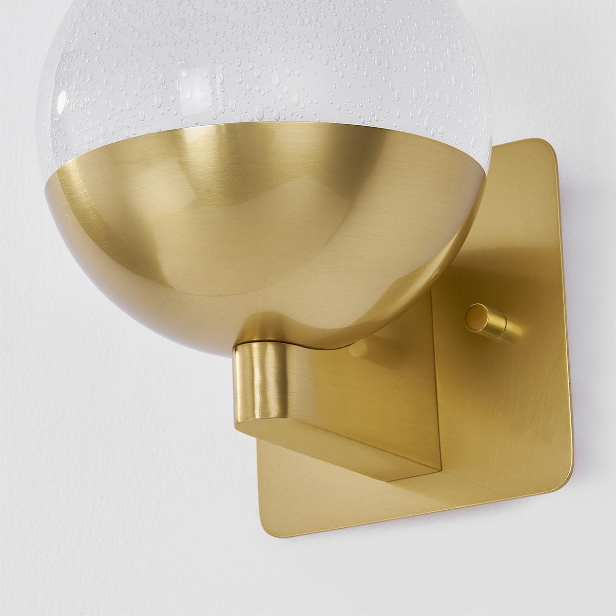 This celestial-inspired sconce features a single large orb suspended on a sleek backplate. The lower half of the fixture is finished in either Aged Brass or Polished Nickel, while the upper half is made from bubbled sprite glass. Powered by energy-efficient LED, Rochford illuminates large areas with an effervescent glow.