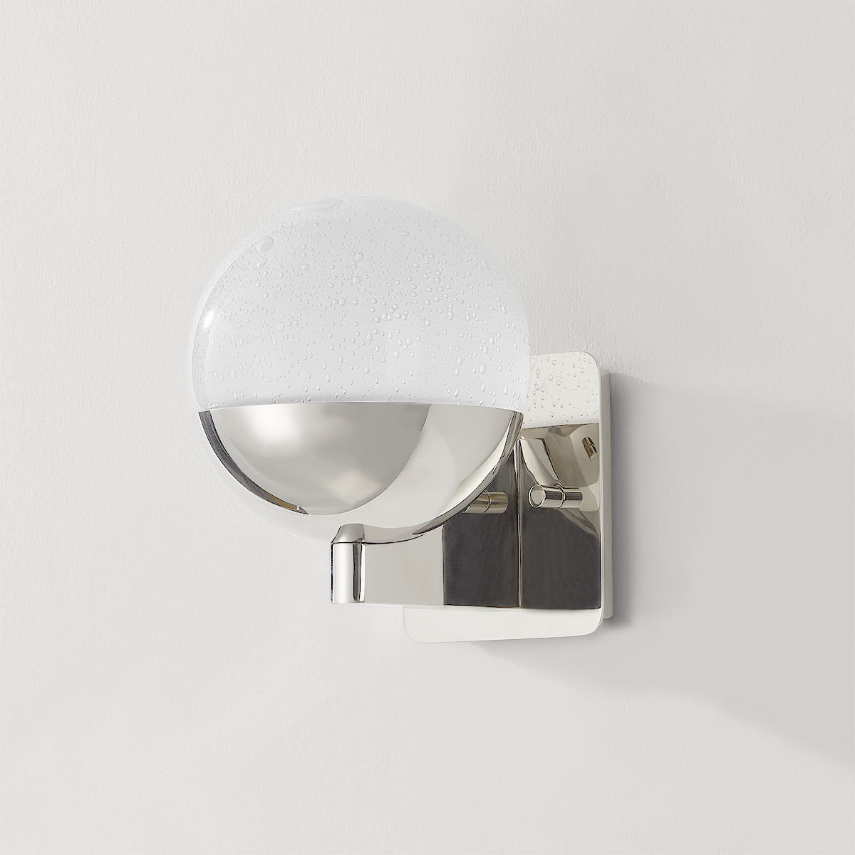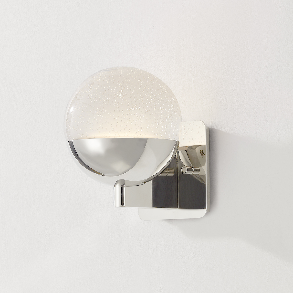This celestial-inspired sconce features a single large orb suspended on a sleek backplate. The lower half of the fixture is finished in either Aged Brass or Polished Nickel, while the upper half is made from bubbled sprite glass. Powered by energy-efficient LED, Rochford illuminates large areas with an effervescent glow.