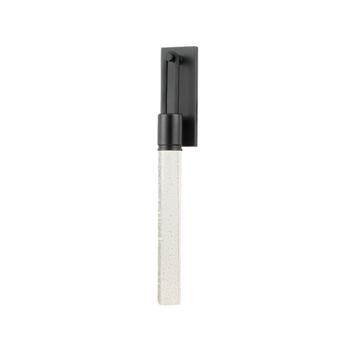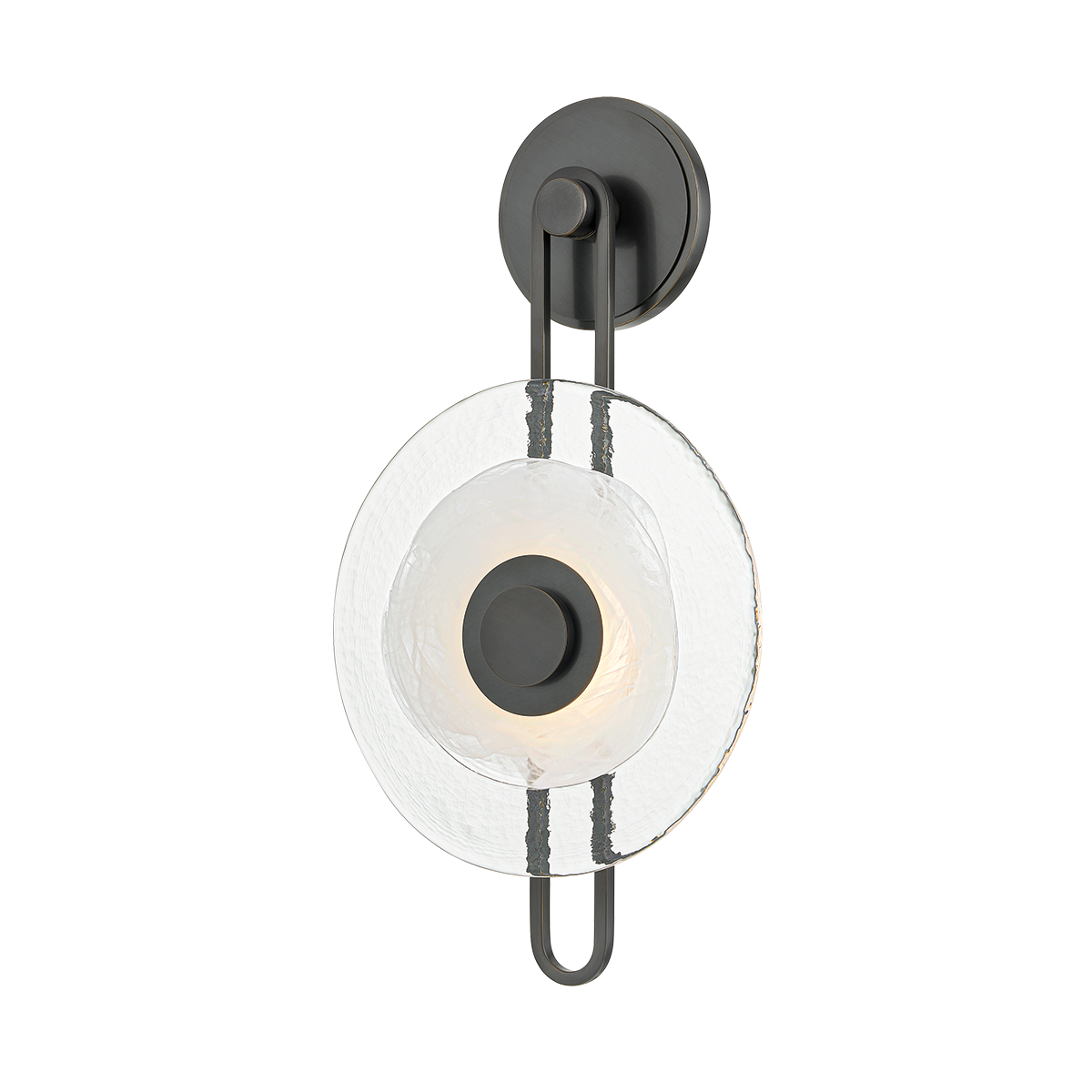 The earring-like design of Keuka Park exudes ornamental, graphic appeal. A thick disc of Blonchino Piastre glass is illuminated at the point where it attaches to the racetrack frame of this striking wall fixture. Whether finished in Aged Brass or Old Bronze, Keuka Park brings modernist artistry to any wall.