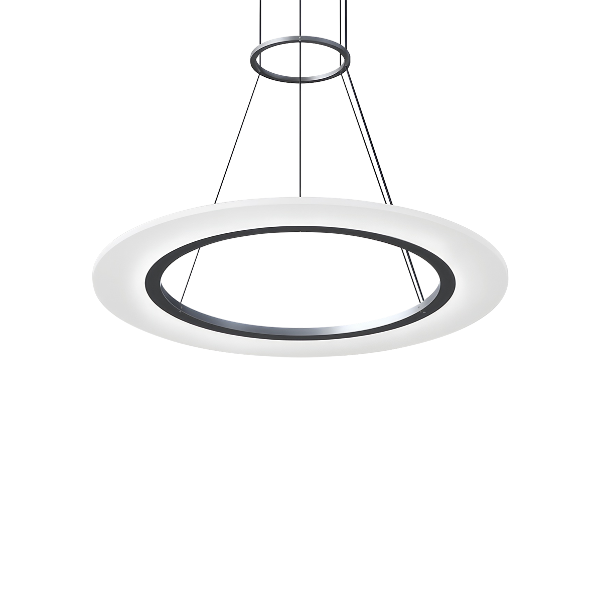 Luminous circular rings suspended in multiple tapered stacks lend the lightness of air to Arctic Rings configurations. Illumination radiates from the surfaces and through the delicate edges of the floating rings. Available in multiple sizes as single pendants and chandelier configurations, this family can be overlayed across the space to create varying arrays of composition. Suitable for both residential and commercial environments.