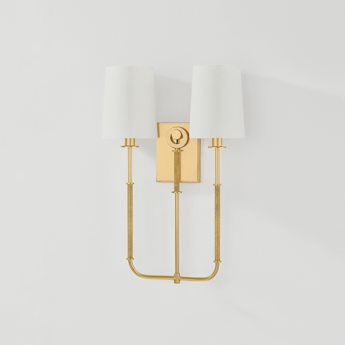 The antique-inspired silhouette of the Glenmont sconce is slender and refined with machine-led hardware. Each stem features a horizontal knurl resembling a screw, adding texture and a contemporary feel to the fixture. In its one-light form, Glenmont is sleek and simplified, while the two-light version responds to the call for dual-armed sconces with a center stem branching into separate sides. Clever details like the circular loop that hooks Glenmont to the backplate accent the metalwork, which is finished in either Aged Brass or an Aged Brass and Dark Bronze combination.