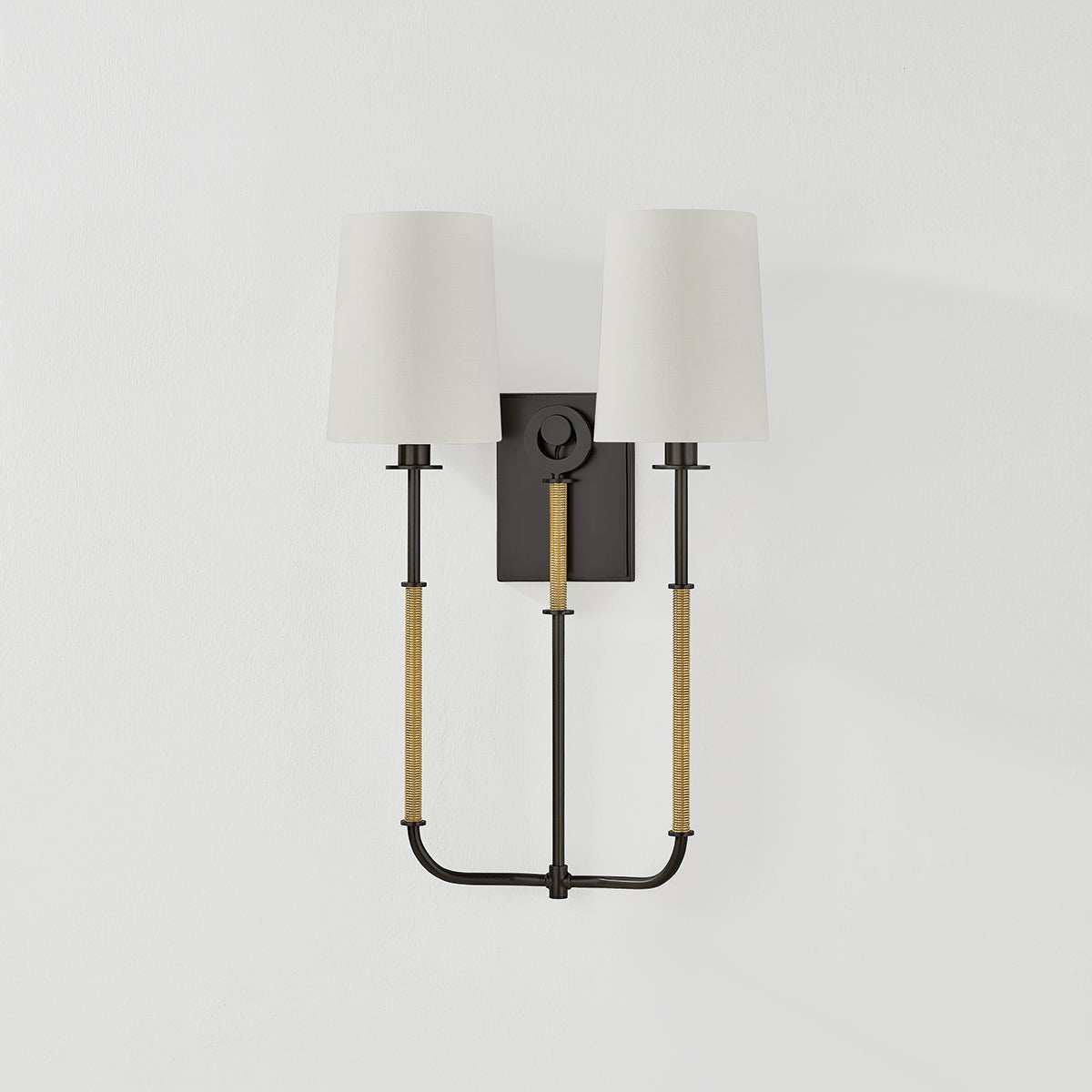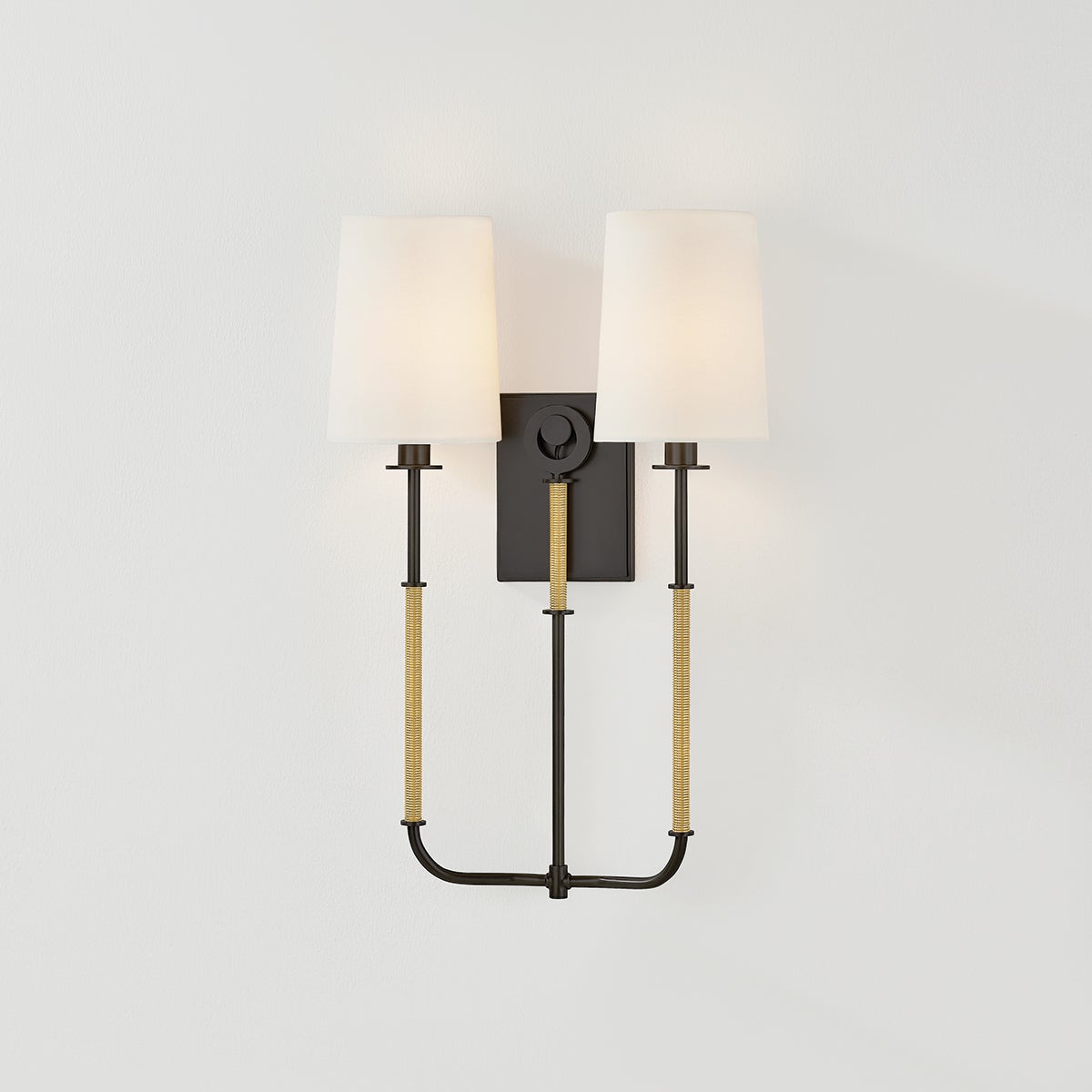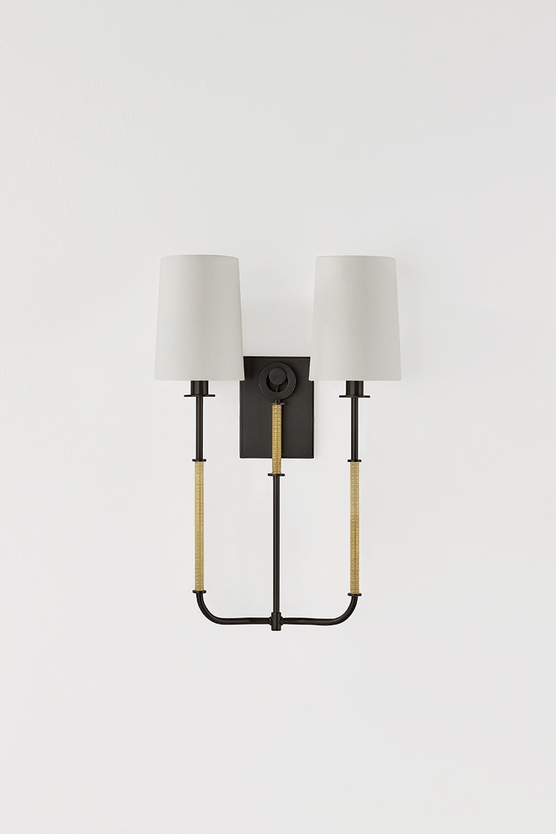 The antique-inspired silhouette of the Glenmont sconce is slender and refined with machine-led hardware. Each stem features a horizontal knurl resembling a screw, adding texture and a contemporary feel to the fixture. In its one-light form, Glenmont is sleek and simplified, while the two-light version responds to the call for dual-armed sconces with a center stem branching into separate sides. Clever details like the circular loop that hooks Glenmont to the backplate accent the metalwork, which is finished in either Aged Brass or an Aged Brass and Dark Bronze combination.