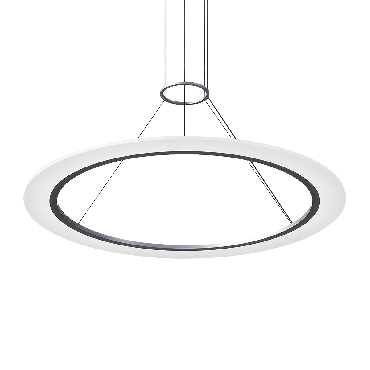 Luminous circular rings suspended in multiple tapered stacks lend the lightness of air to Arctic Rings configurations. Illumination radiates from the surfaces and through the delicate edges of the floating rings. Available in multiple sizes as single pendants and chandelier configurations, this family can be overlayed across the space to create varying arrays of composition. Suitable for both residential and commercial environments.