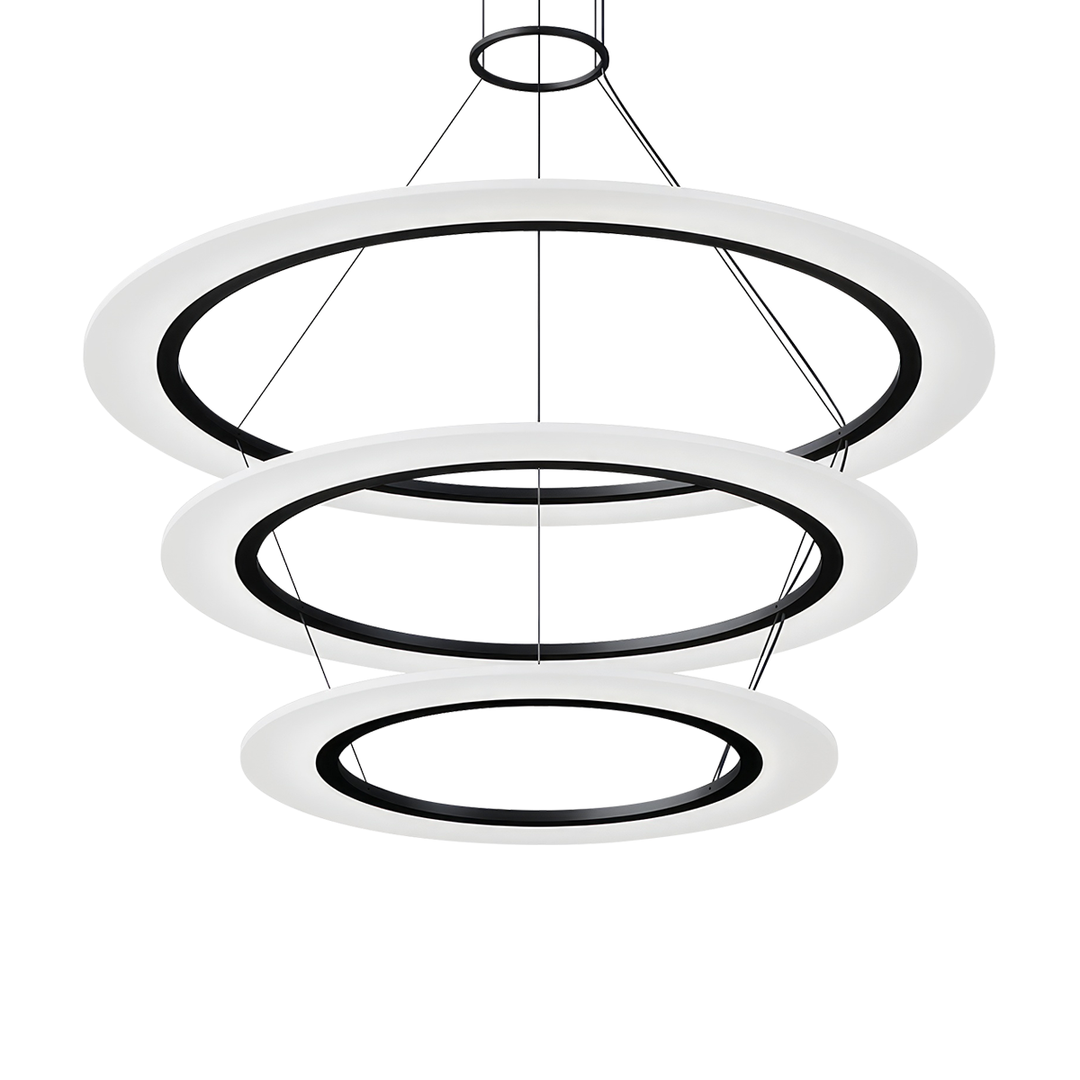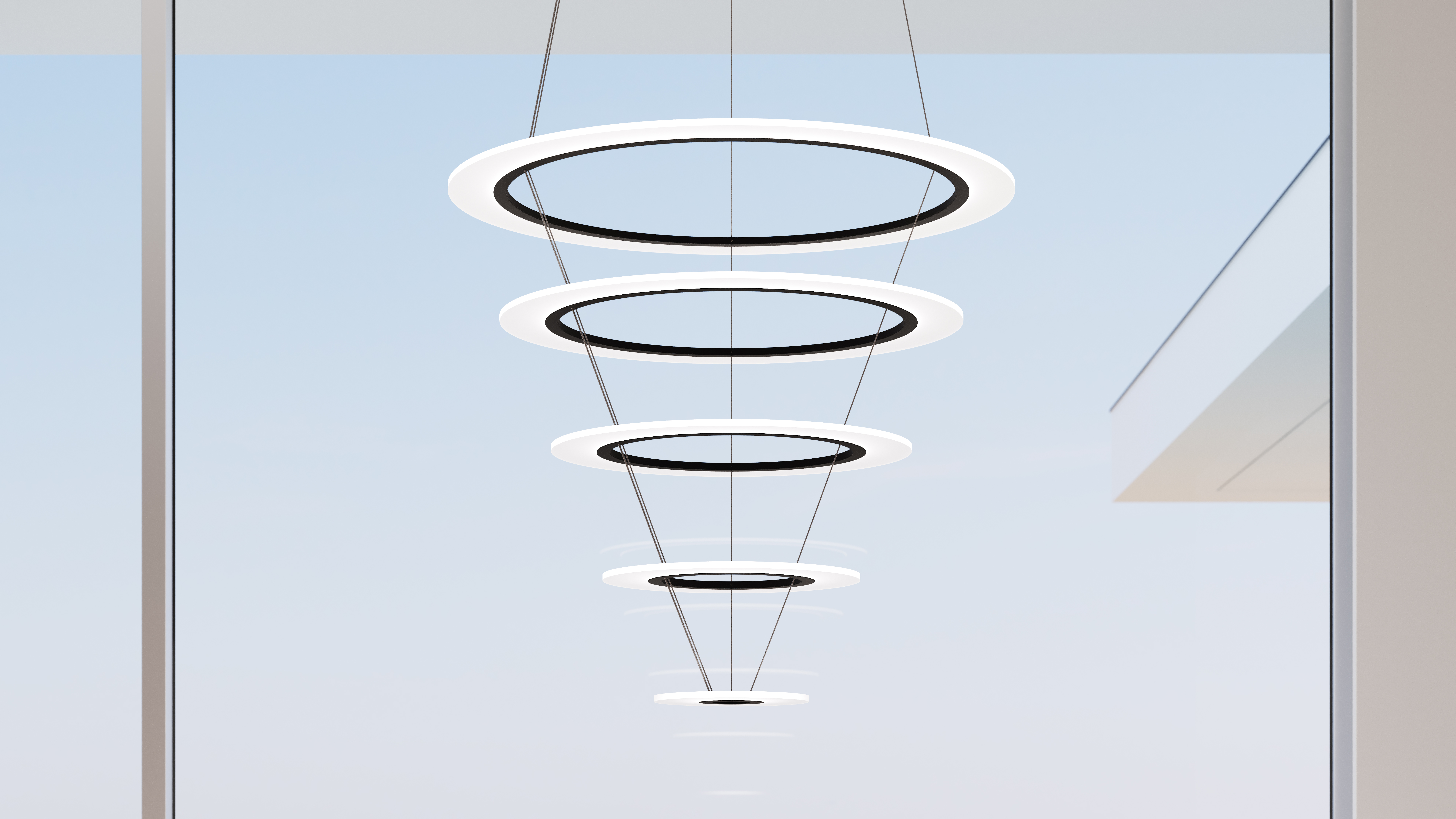 Luminous circular rings suspended in multiple tapered stacks lend the lightness of air to Arctic Rings configurations. Illumination radiates from the surfaces and through the delicate edges of the floating rings. Available in multiple sizes as single pendants and chandelier configurations, this family can be overlayed across the space to create varying arrays of composition. Suitable for both residential and commercial environments.