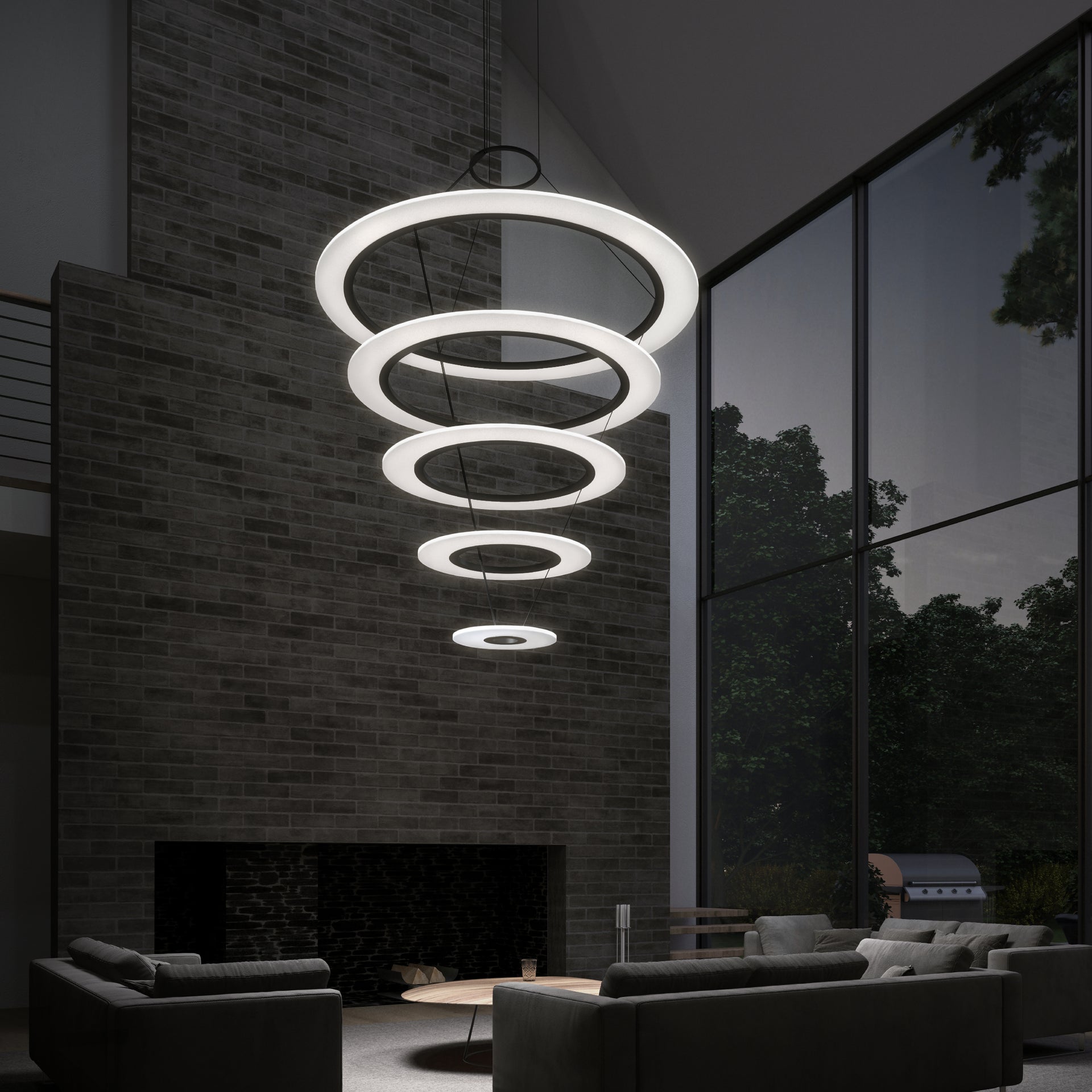 Luminous circular rings suspended in multiple tapered stacks lend the lightness of air to Arctic Rings configurations. Illumination radiates from the surfaces and through the delicate edges of the floating rings. Available in multiple sizes as single pendants and chandelier configurations, this family can be overlayed across the space to create varying arrays of composition. Suitable for both residential and commercial environments.