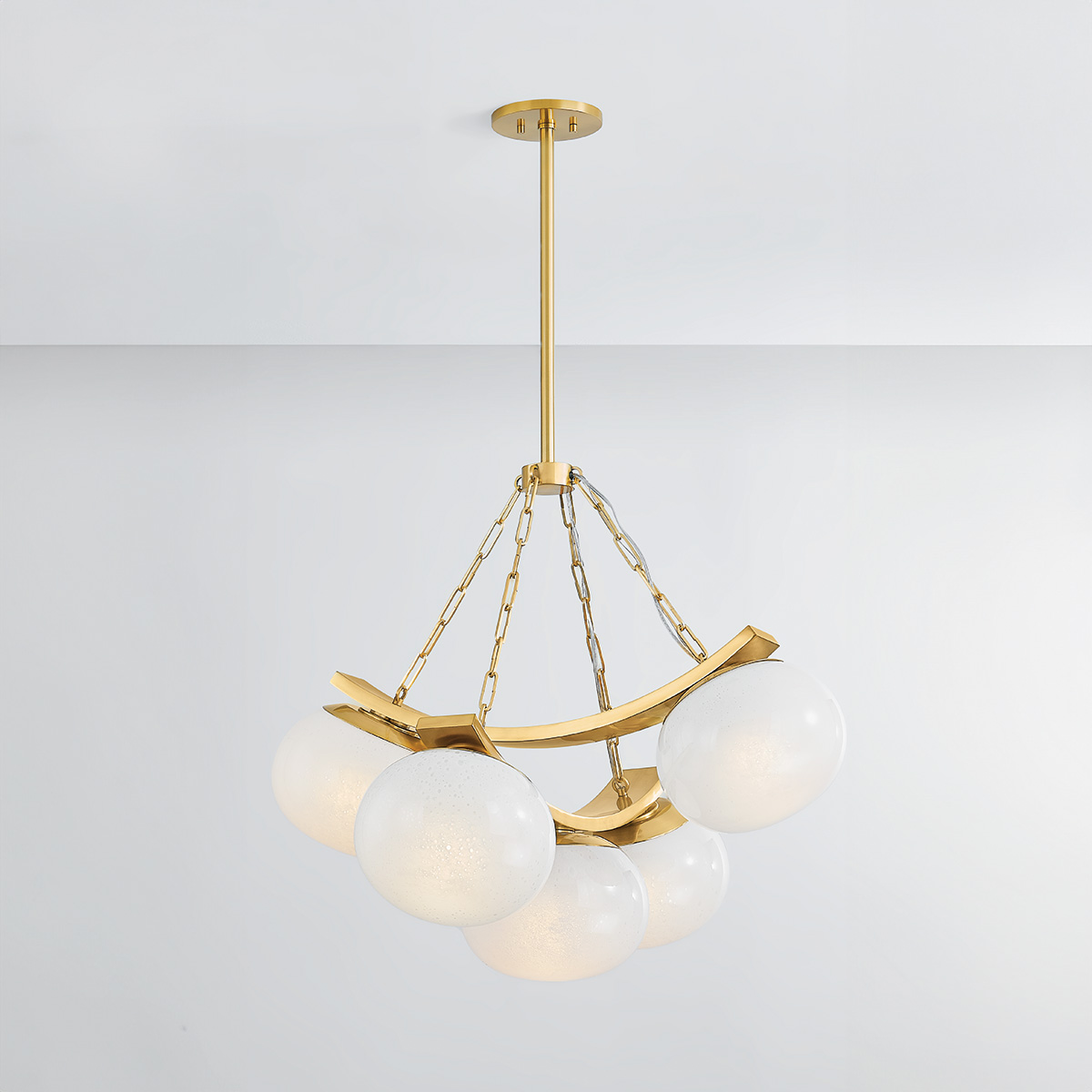 Balancing hard and soft elements, Duxbury creates a modern architectural lighting experience inspired by morning dew collecting on blades of grass. Voluminous cloud seedy glass shades are suspended from stark metal bands and chains, creating a powerful yet pleasing contrast. Duxbury is available as a 5 or 7-light chandelier with an Aged Brass or Distressed Bronze finish.