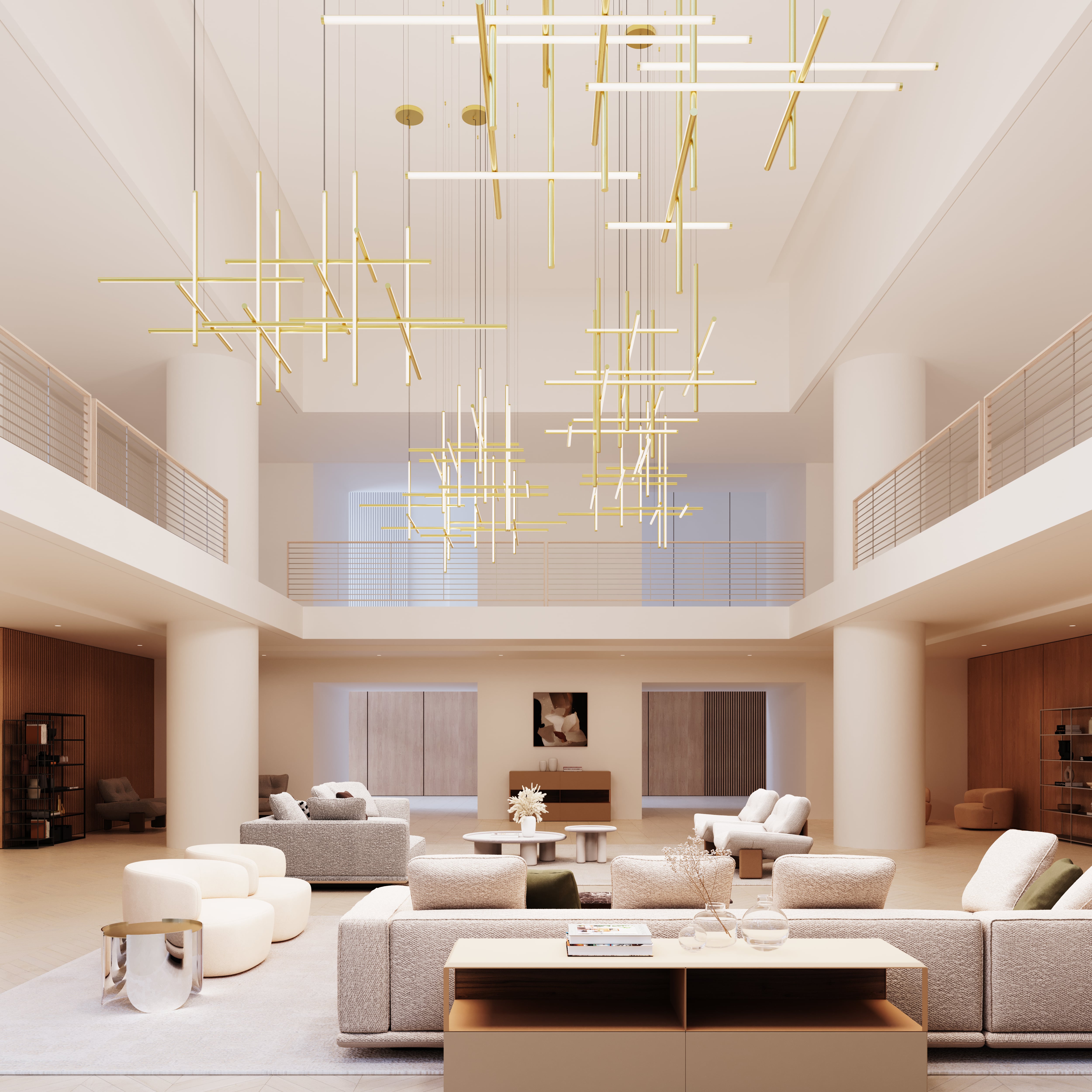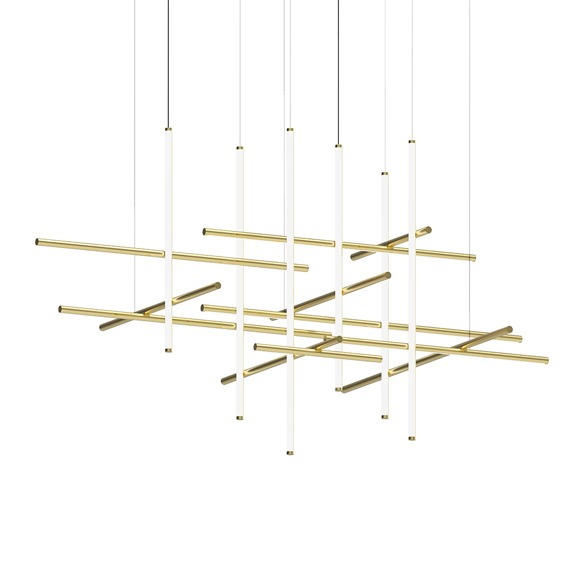 A showstopping feat of modern geometry, the Labyrinth family features puzzle-like chandeliers with open architectural frames. Intersecting vertical and horizontal tubes form multi-light LED compositions designed to illuminate large areas. Labyrinth is available in three sizes with a choice of Brass or Satin Black finishes.