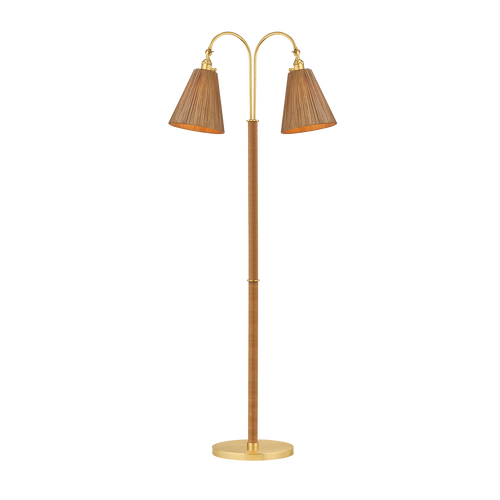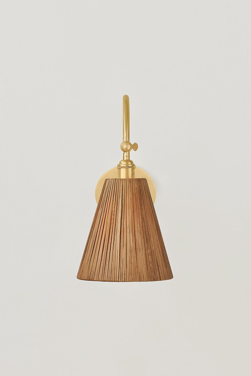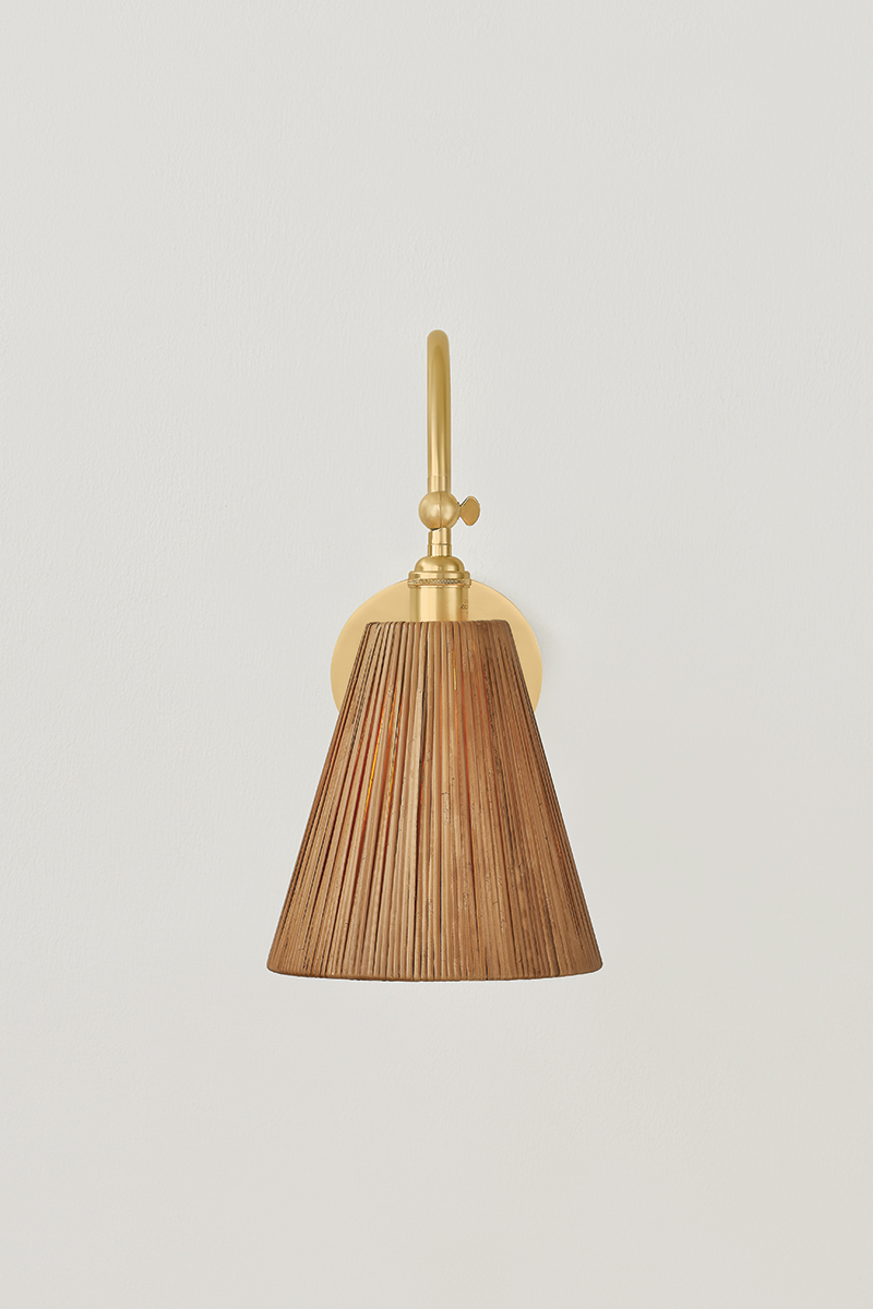 The Ruthin family combines swooping metalwork with natural rattan to create playful everyday basics. The floor lamp taps into the trend of two-light silhouettes, adding swivel heads for precise, directional lighting. To match the shades, the lamp’s base is wrapped in rattan. Ruthin is also available as a single-light sconce with a gestural gooseneck arm supporting the shade. Aged Brass metalwork adds a subtle note of shine to these designs.
