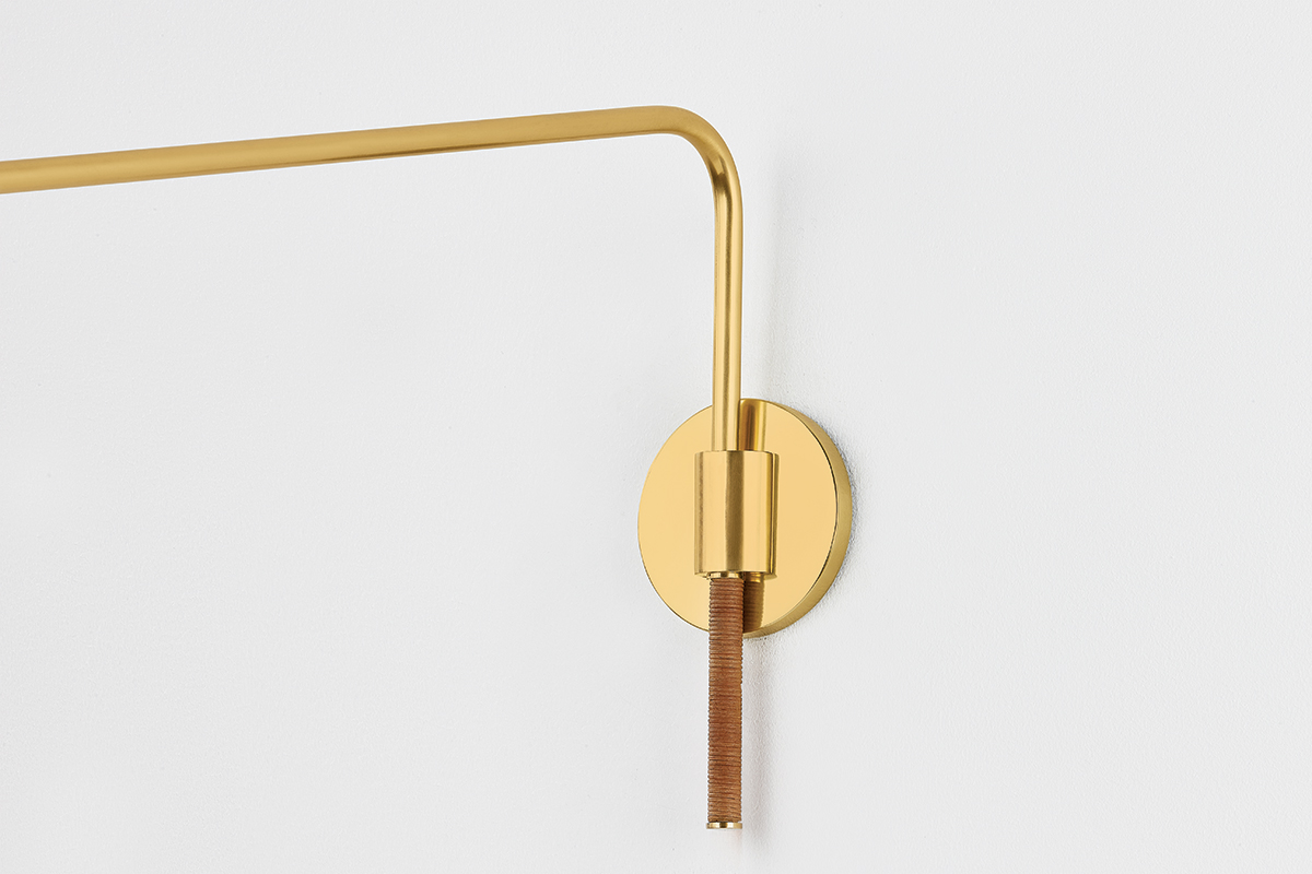 The Narragansett family tells an innovative design story marked by the use of tactile materials. While the silhouette of this sconce and floor lamp are understated, the Aged Brass metalwork and rattan-wrapped details mix hard and soft, manmade and natural. The elongated swing arm feature makes Narragansett perfect for bedside, desk, or reading nook illumination.