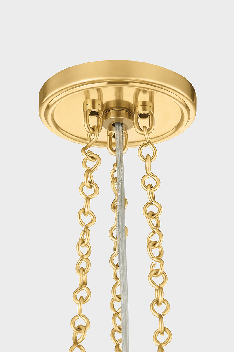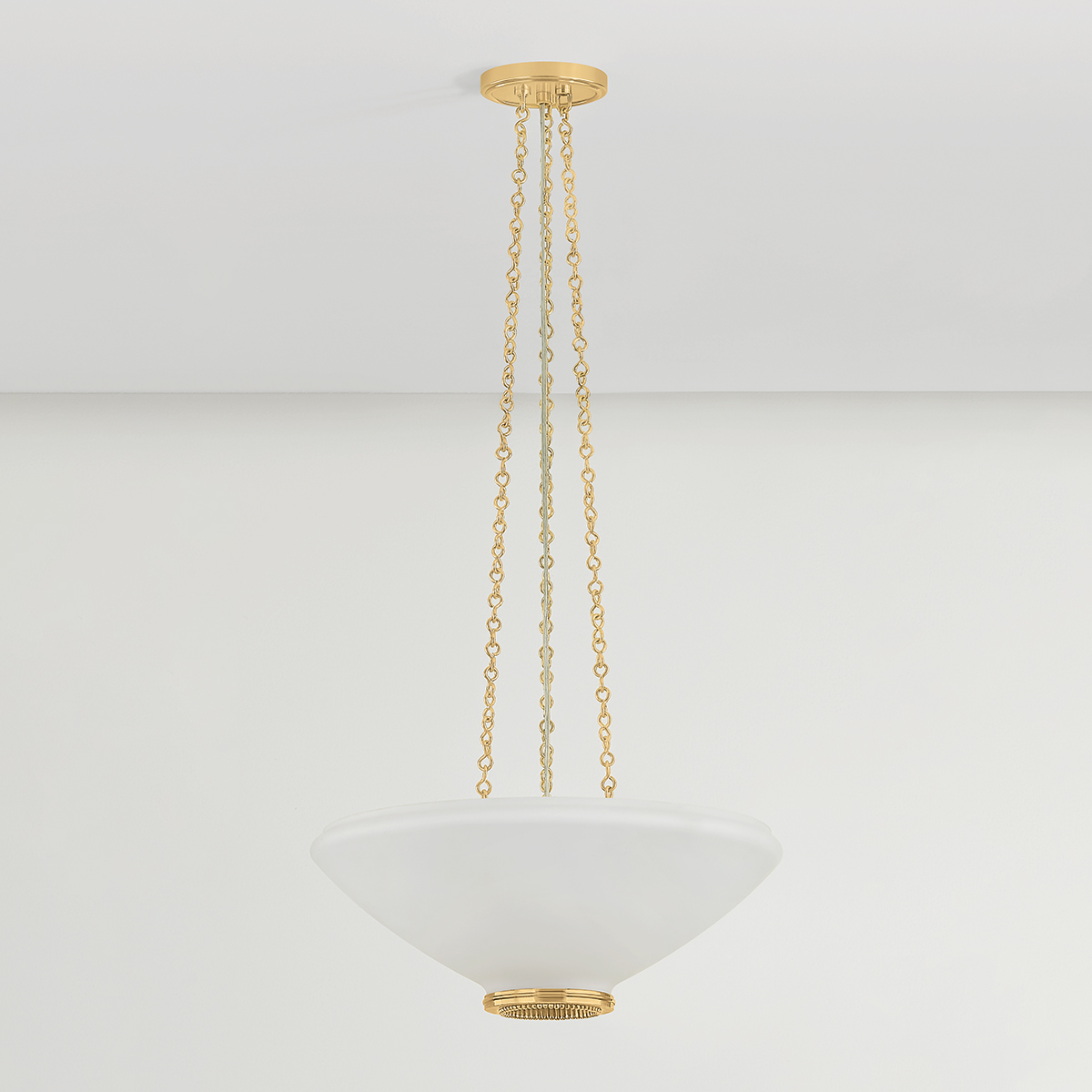 The traditional silhouette of the Awosting pendant receives a fashionable update with jewelry-inspired details. Blown from opal matte glass, the shade’s softened edges evoke a sense of calm, organic beauty. As light passes through the oculus, the lace-like metalwork becomes more noticeable. At the top, a trio of delicate vintage-inspired chains supports the shade. Awosting is available in two sizes and two finishes, Aged Brass and Dark Bronze.