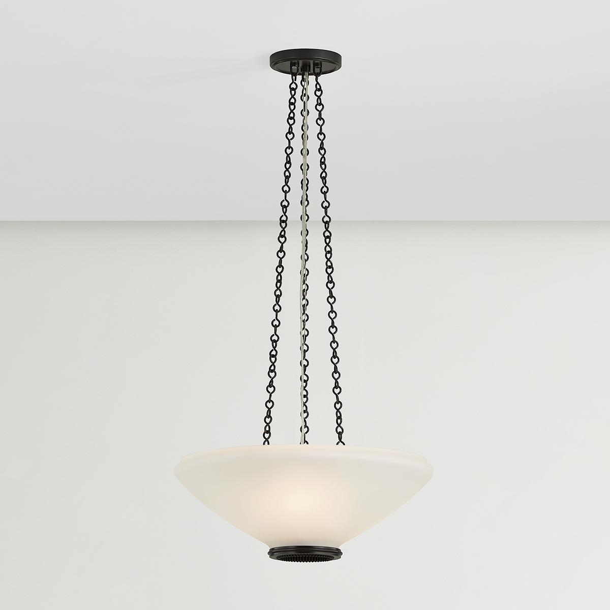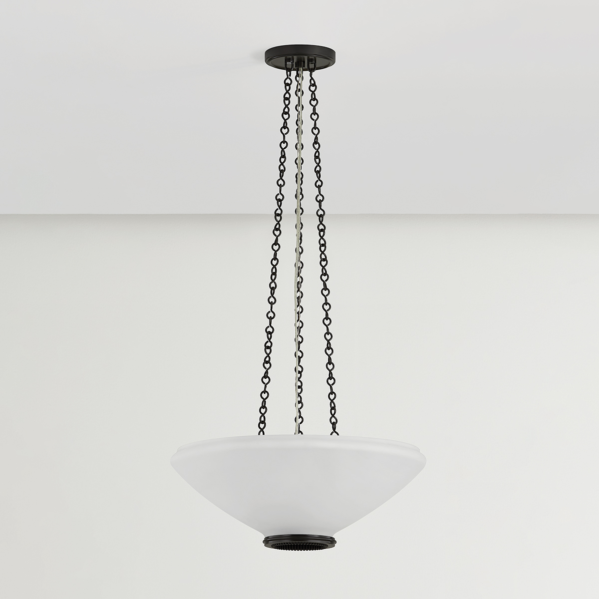 The traditional silhouette of the Awosting pendant receives a fashionable update with jewelry-inspired details. Blown from opal matte glass, the shade’s softened edges evoke a sense of calm, organic beauty. As light passes through the oculus, the lace-like metalwork becomes more noticeable. At the top, a trio of delicate vintage-inspired chains supports the shade. Awosting is available in two sizes and two finishes, Aged Brass and Dark Bronze.