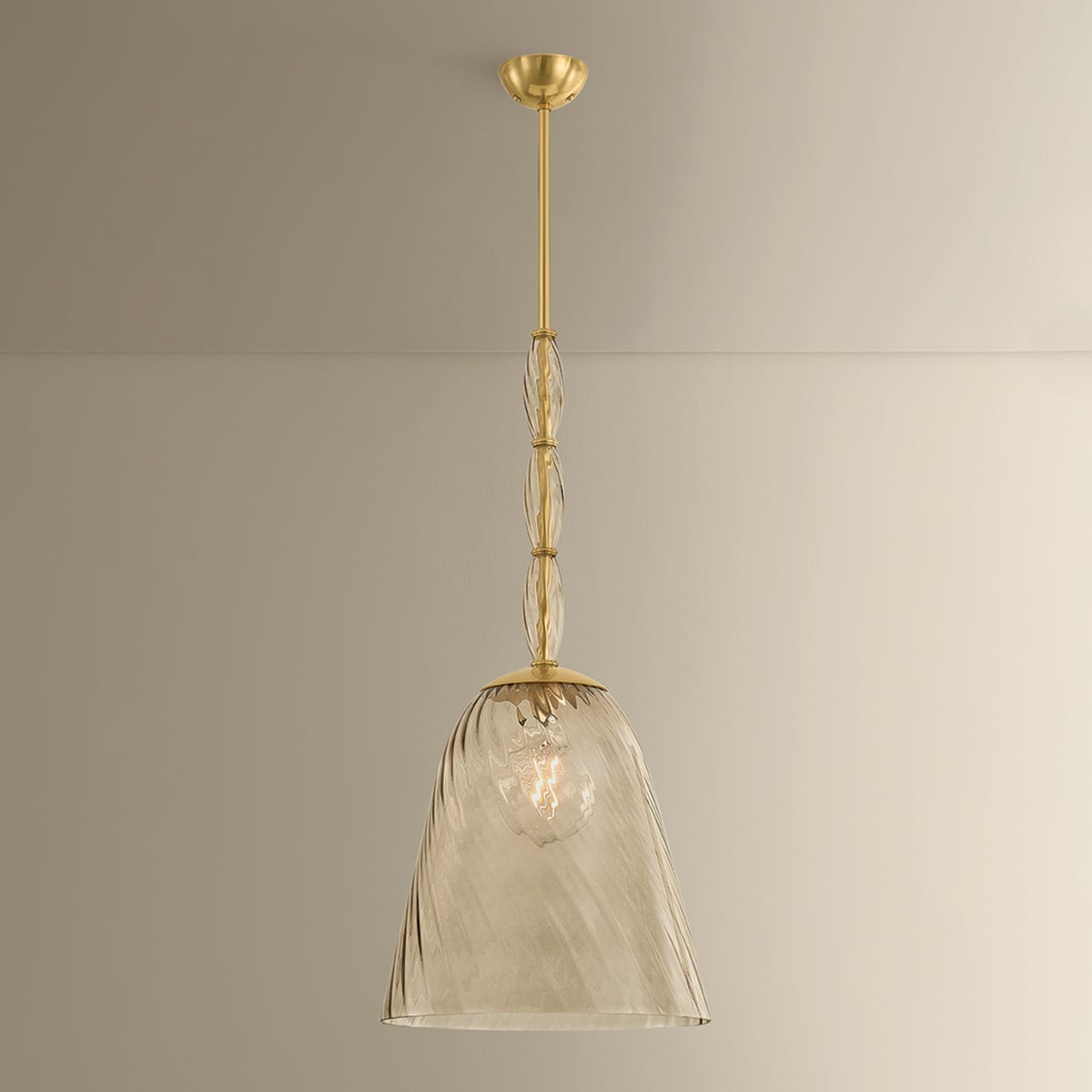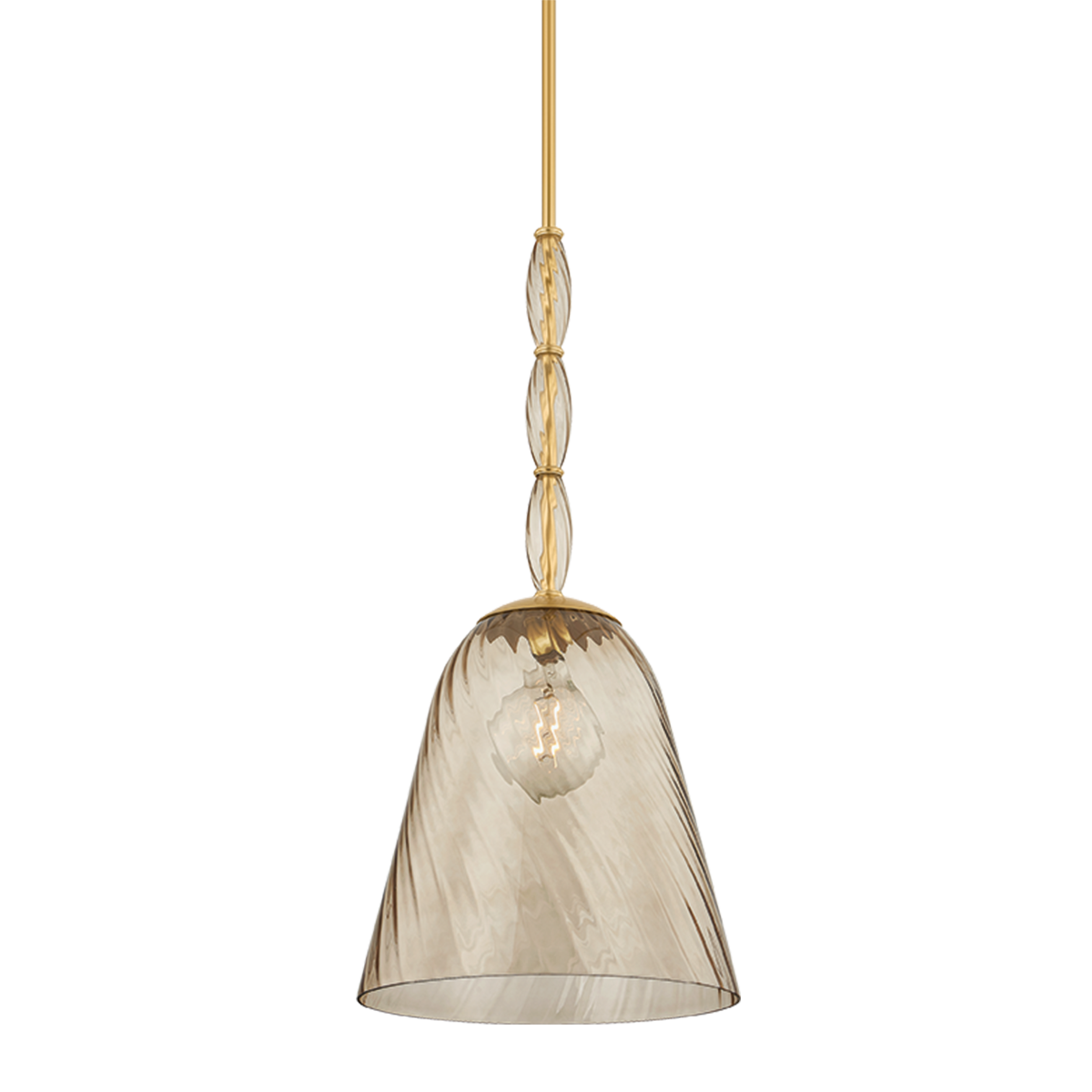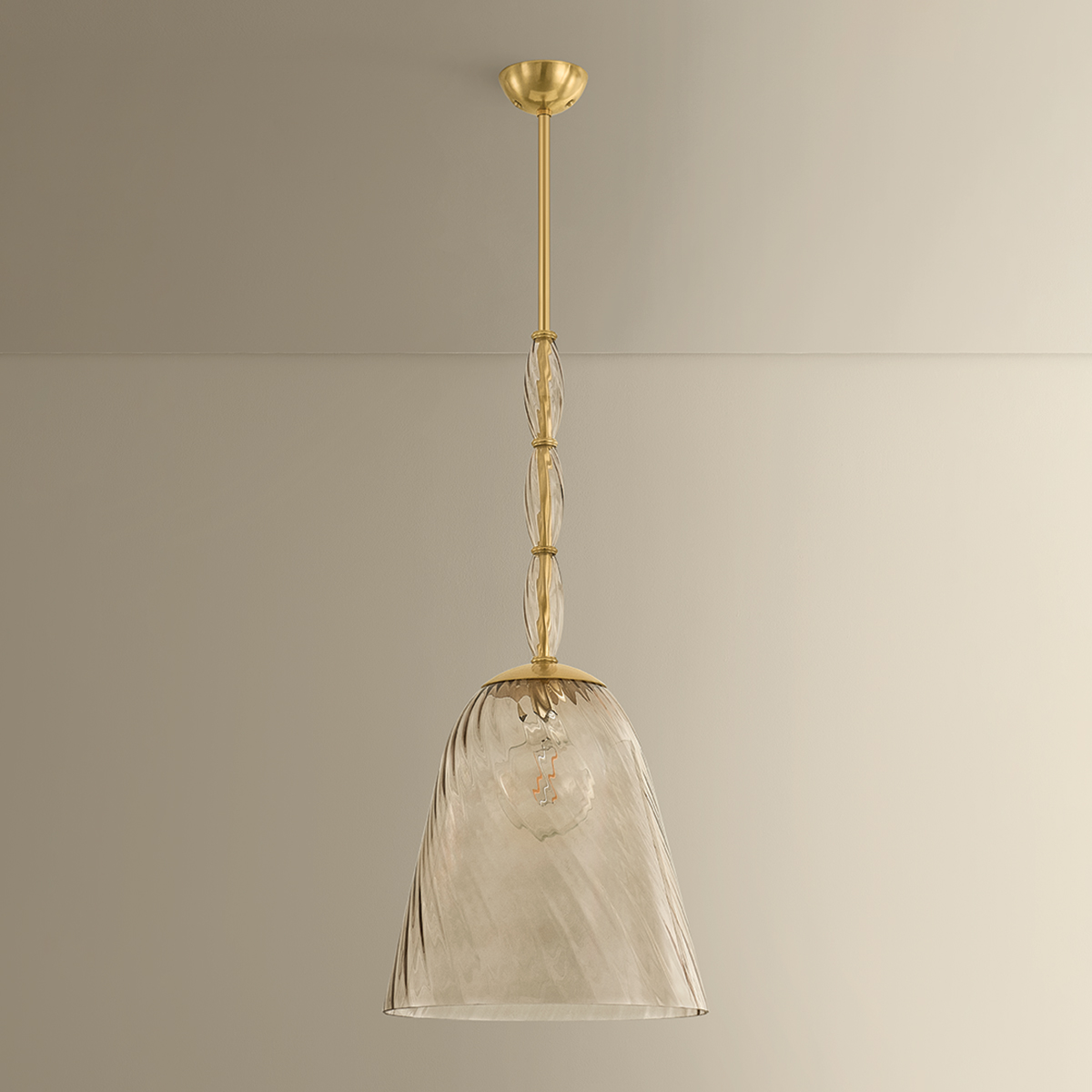 The twisted artisan glass and jewelry-inspired fittings of the Bleecker family channel the spirit of vintage elegance. When lit, the light bronze hue and internal optics of the glass come alive with a sense of movement. Aged Brass cuffs articulate each form, cinching the design to create a silhouette that is simultaneously slender and voluminous. Available as a torchiere-style floor lamp and pendants in two sizes, this family introduces retro glamour to kitchens, dining spaces, and living areas.