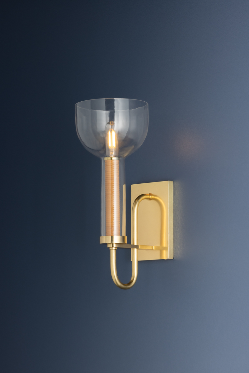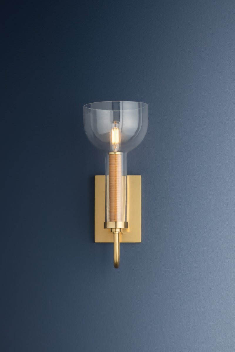 This design-forward sconce bridges modern and transitional elements. The upturned half-dome clear glass shade melds into a longer glass tube, revealing a tight rattan wrap around the stem. Supported by a looping stem finished in Aged Brass, it is the perfect usable everyday staple with eye-catching style details.
