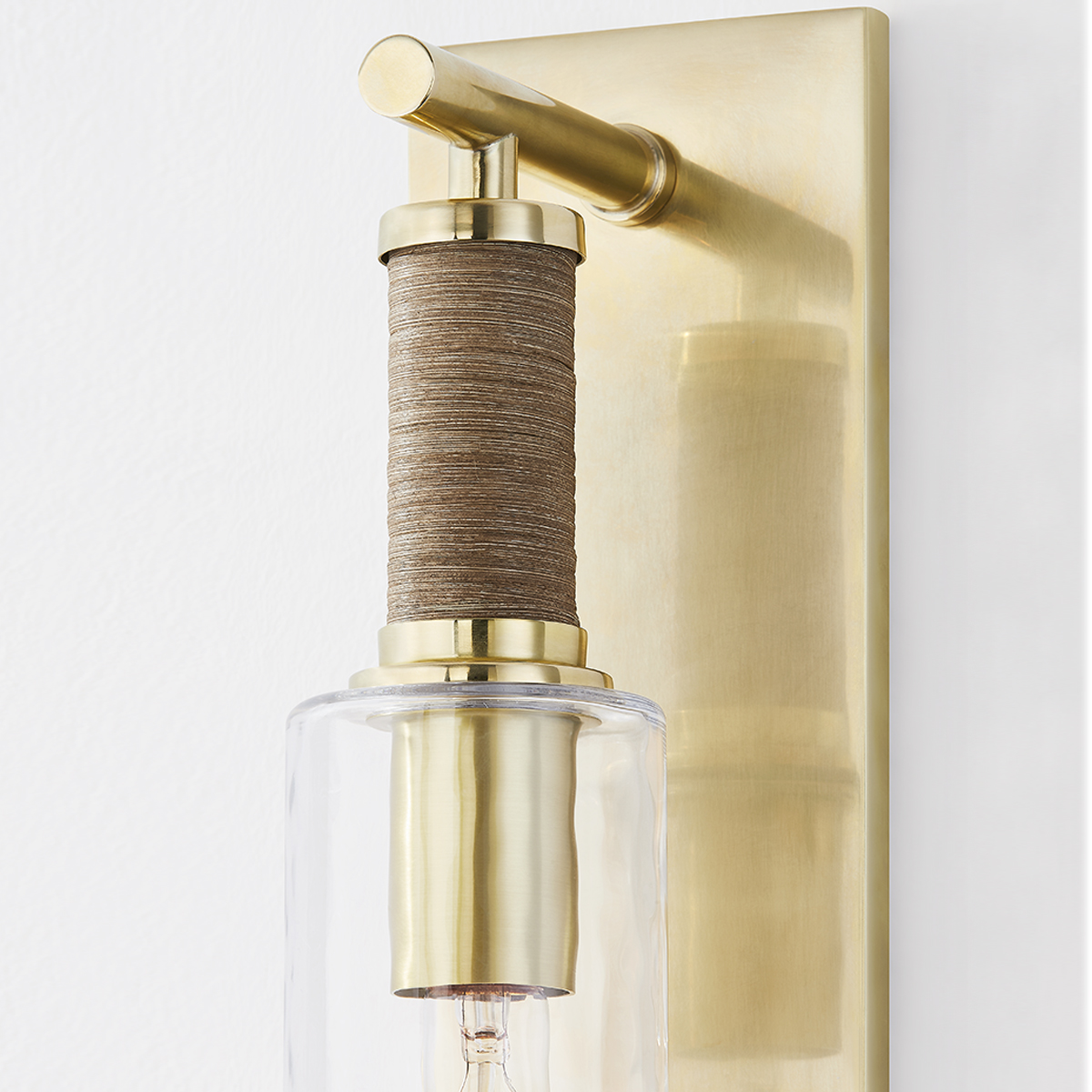 Eastchester takes the beautiful combination of Aged Brass and clear glass and adds a touch of rattan for an elevated, organic aesthetic. The top of an elongated cylindrical glass shade is wrapped in rattan and displayed in front of a rectangular metal backplate. A perfect way to add a natural element into a variety of design styles.