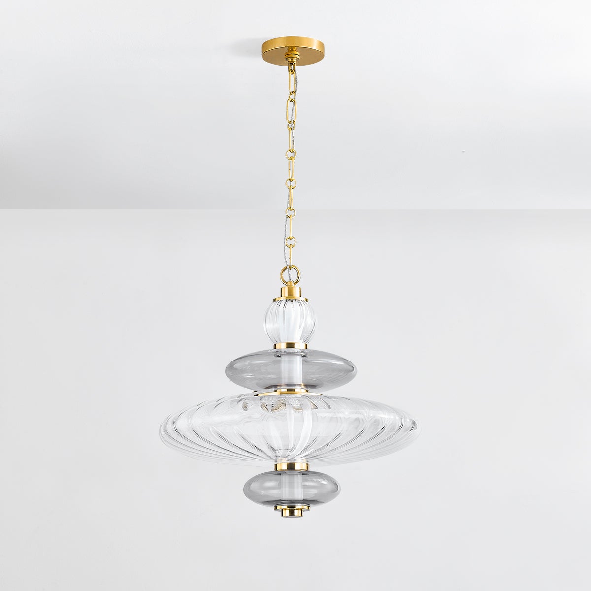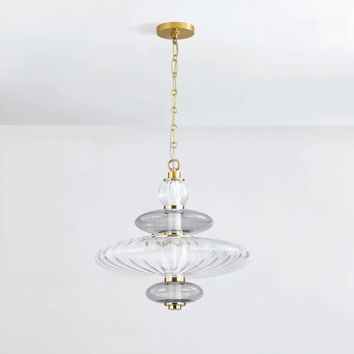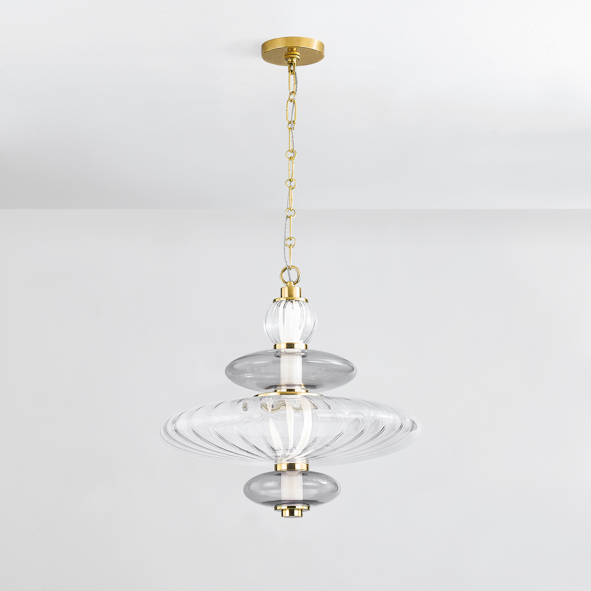 Old meets new in the nostalgic Williams pendant. Streamlined renditions of classic glass techniques are stacked to create a striking totemic composition. Alternating clear optic and smoked glass shades are stacked around a single LED tube, which serves as the core of this eye-catching fixture. Williams is available in two sizes and is finished in Aged Brass.