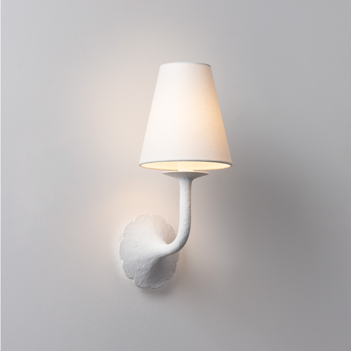 Inspired by a flower in bloom, the charming Winnipeg sconce features delicate scalloped edges and a tailored silhouette. The botanical backplate swoops elegantly upwards to cradle the light source, which glows through a tapered white linen shade. A White Plaster finish imparts a chic, contemporary feel, while the Vintage Gold Leaf is refined and classic.