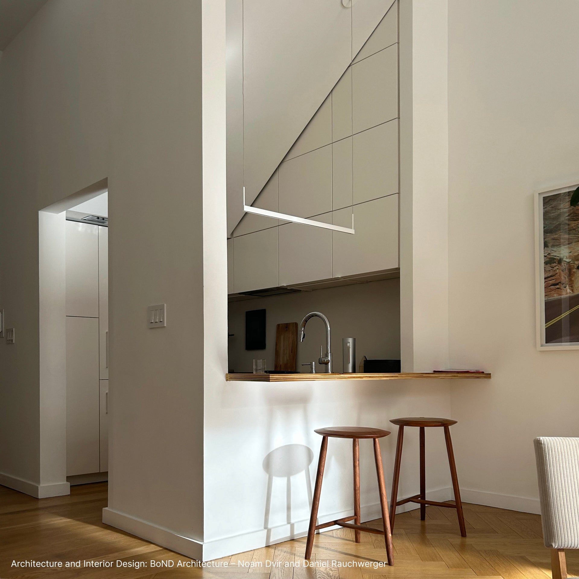 The Thin-Line™ family leans into minimalism with bold angularity. The result is a series of suspended metal bars with integrated LED. To eliminate glare, the light is cast against the wall in its sconce format, which is available in five sizes. Thin-Line™ also comes as a pendant in five sizes. Finish options include Satin White, Satin Black, and Bright Satin Aluminum.