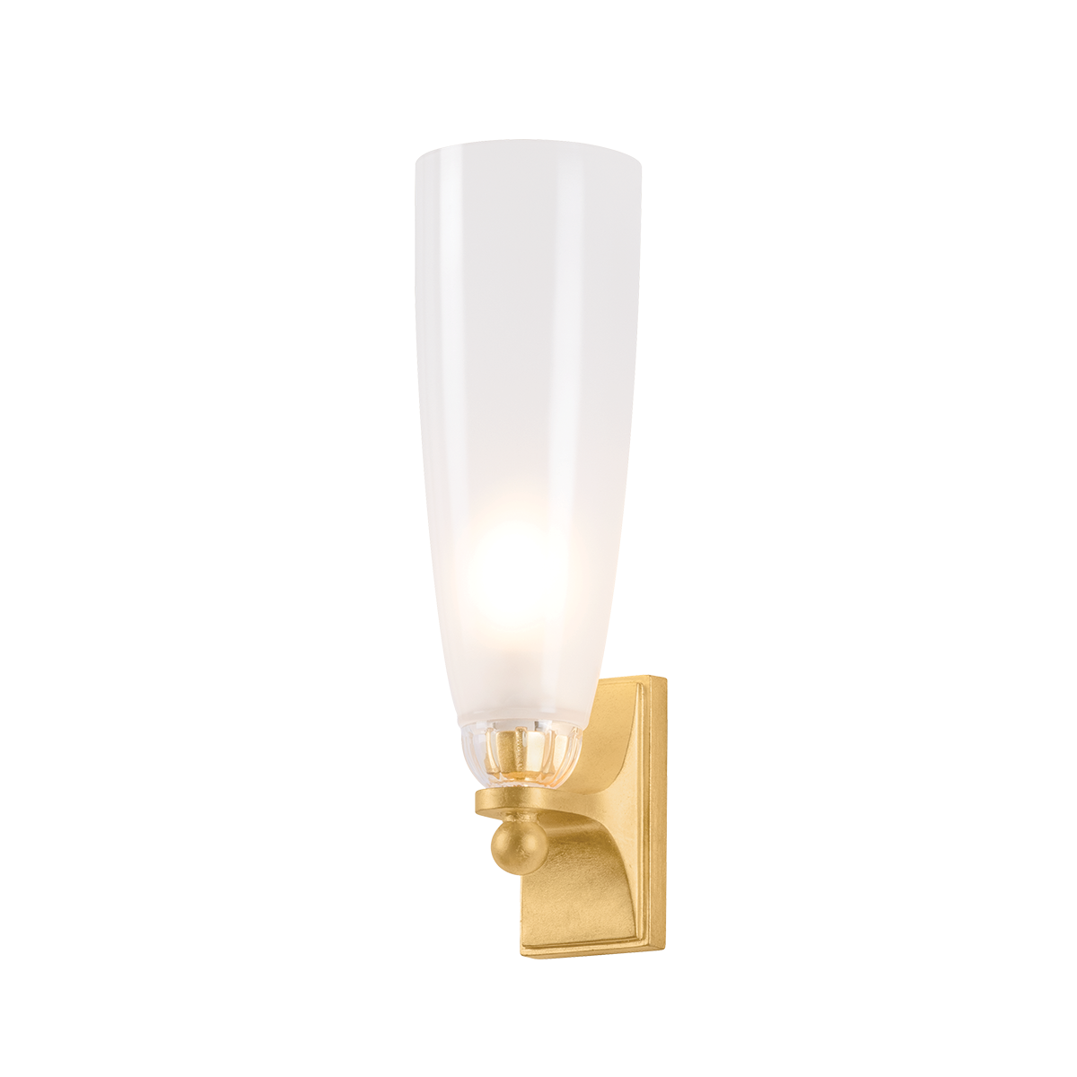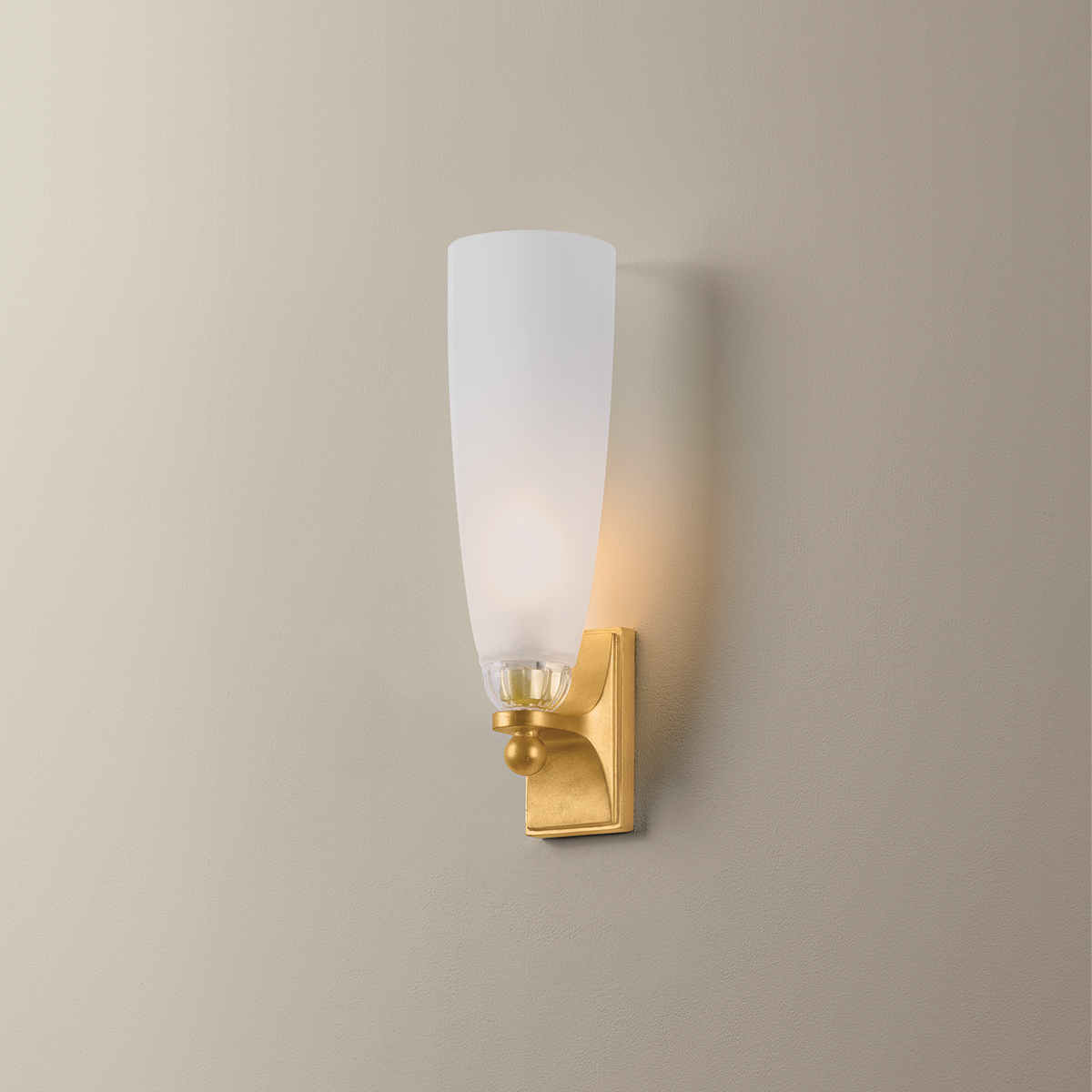 The Ravenswood sconce leans into pleasing symmetry. With one or two lights, this hallway-to-bath crossover features translucent clear etched glass that lets the light filter through with an inviting glow. The shades are supported by Vintage Gold Leaf-finished caps with rounded edges, adding a decorative, upscale flourish.