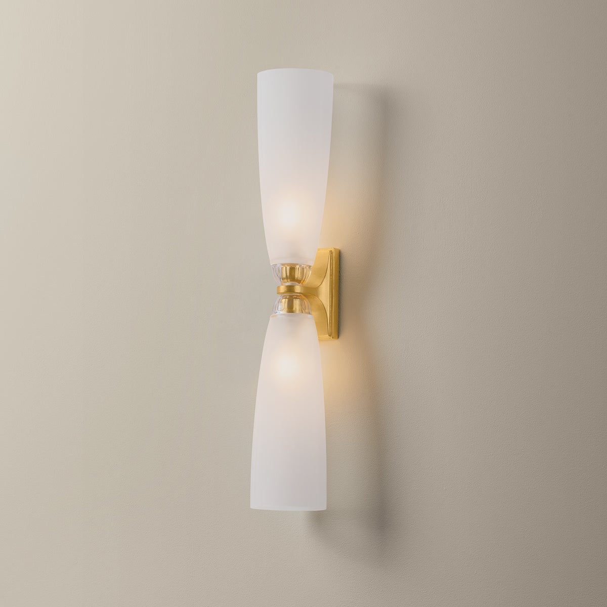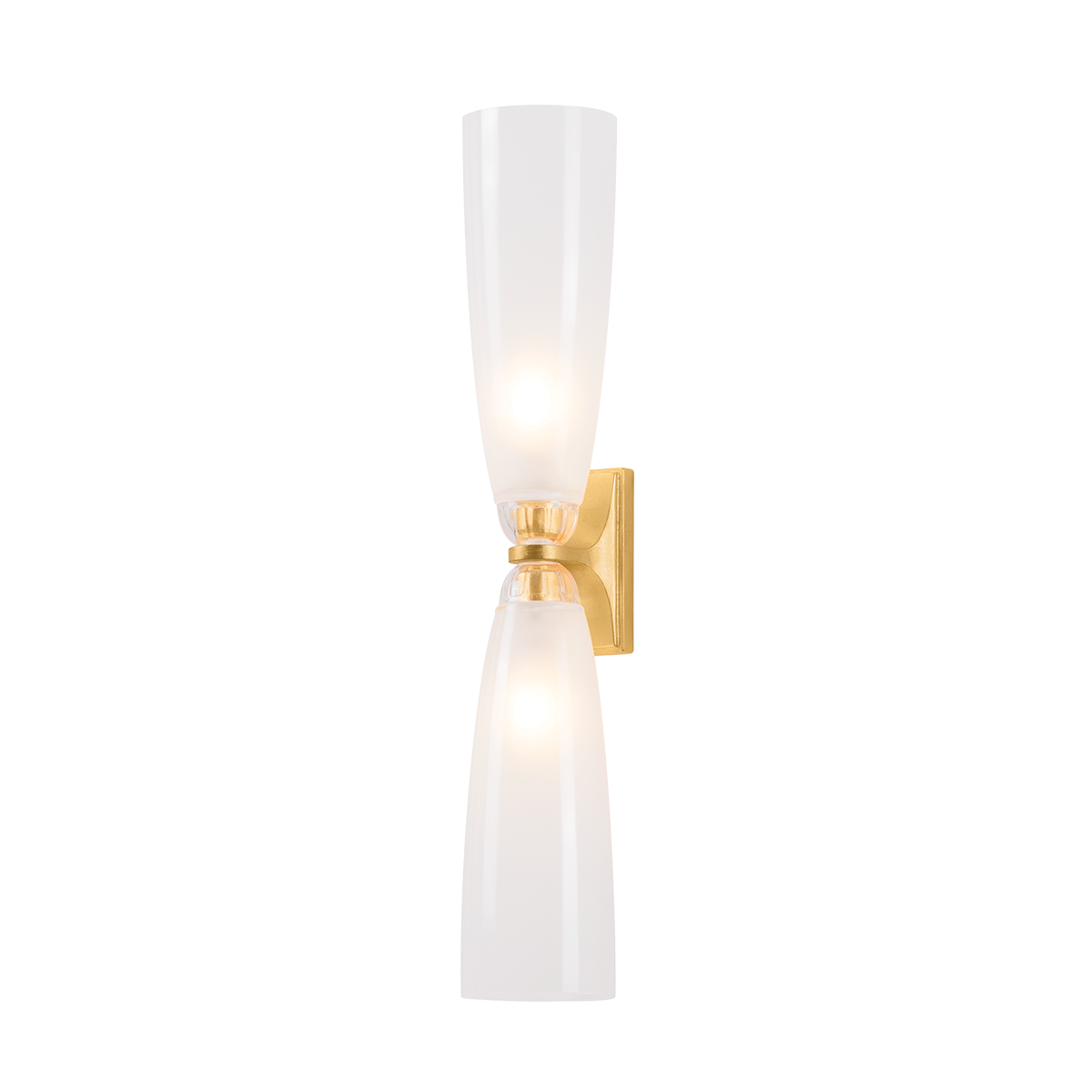 The Ravenswood sconce leans into pleasing symmetry. With one or two lights, this hallway-to-bath crossover features translucent clear etched glass that lets the light filter through with an inviting glow. The shades are supported by Vintage Gold Leaf-finished caps with rounded edges, adding a decorative, upscale flourish.
