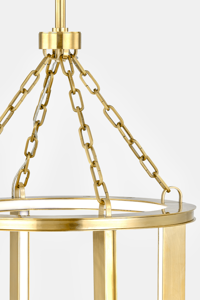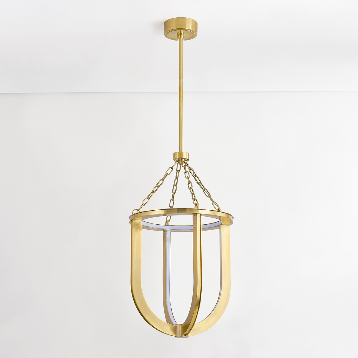 Inspired by a lantern, Tournu features an open cage-like silhouette with LED lining its interior. It is elegantly suspended from the ceiling by a single sleek rod, illuminating a wide area. Available in two sizes with the choice of an Aged Brass or Matte White Acrylic finish, it adds an artful note to living and commercial spaces.