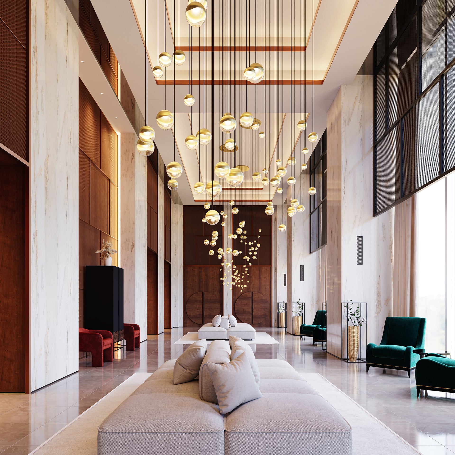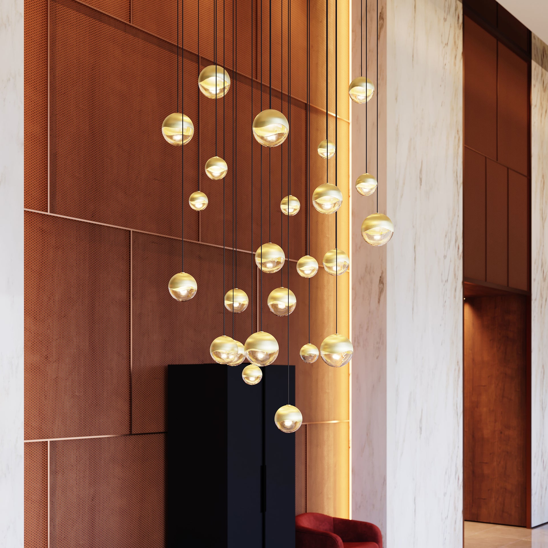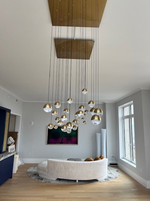 Precise or random, clustered or free, the Grapes® family explores a full spectrum of design possibilities. Suspended from slender stems, luminous LED spheres are capped in metal. A faceted crystal shade refracts the light with a dazzling radiance. Grapes is available as a single pendant or in configurations of up to 24 lights, with finish options including Polished Chrome, Satin Nickel, and Brass.