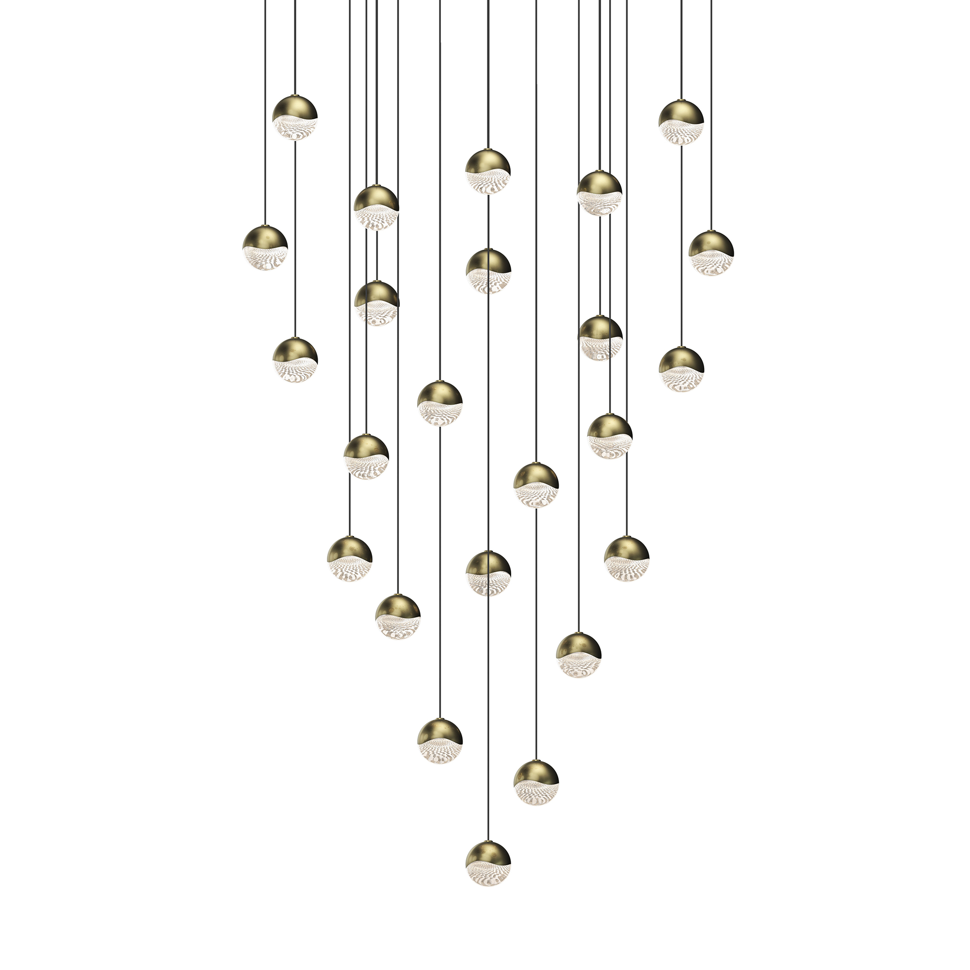 Precise or random, clustered or free, the Grapes® family explores a full spectrum of design possibilities. Suspended from slender stems, luminous LED spheres are capped in metal. A faceted crystal shade refracts the light with a dazzling radiance. Grapes is available as a single pendant or in configurations of up to 24 lights, with finish options including Polished Chrome, Satin Nickel, and Brass.