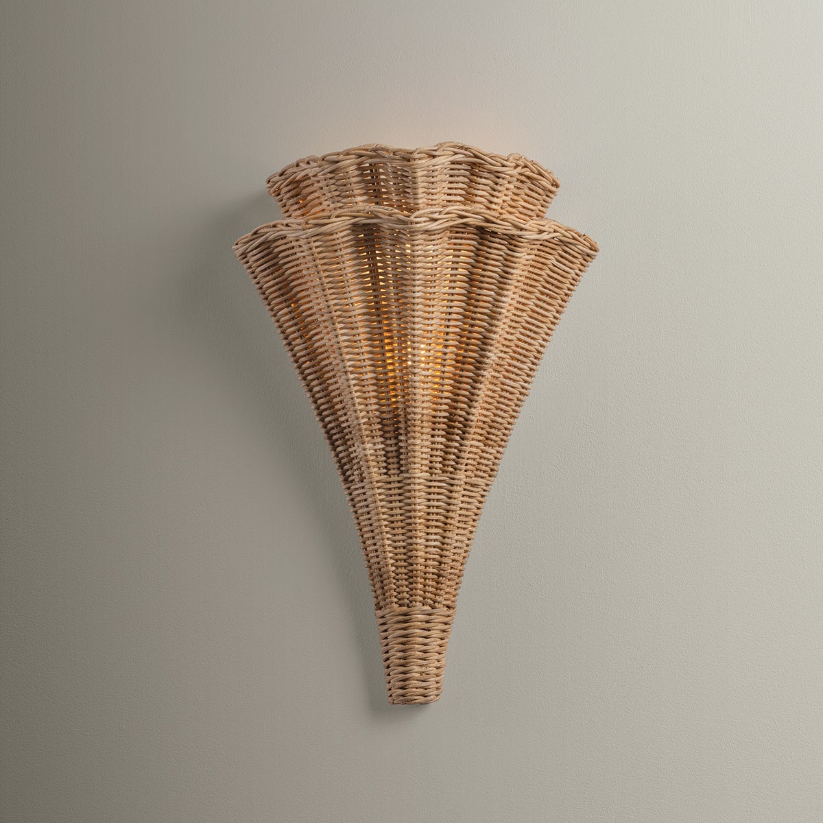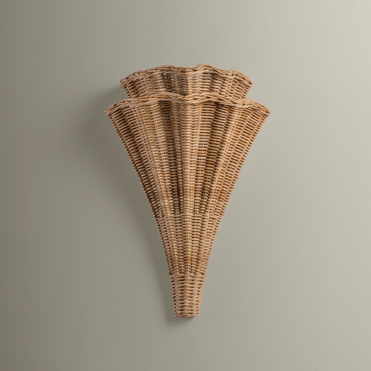 Airy and organic, the Arverne sconce lends breezy coastal style to any space. Two hand-woven wicker shades nest together in a layered, seashell silhouette, complete with softly scalloped edges. As light seeps through the tapered forms, it brings out the natural texture and tonal variations of the rattan. Tucked behind the shade, the painted Vintage Gold Leaf hardware remains concealed.