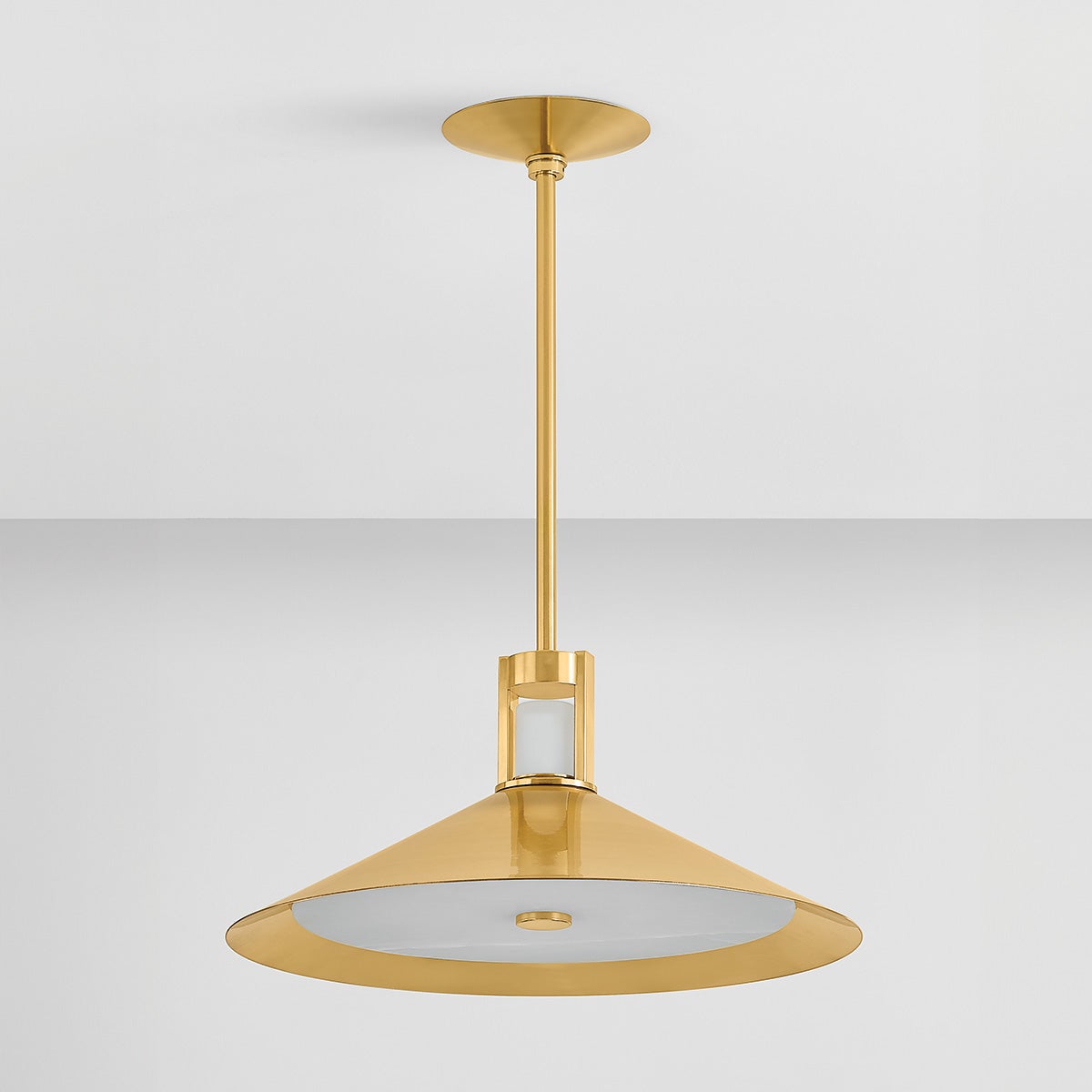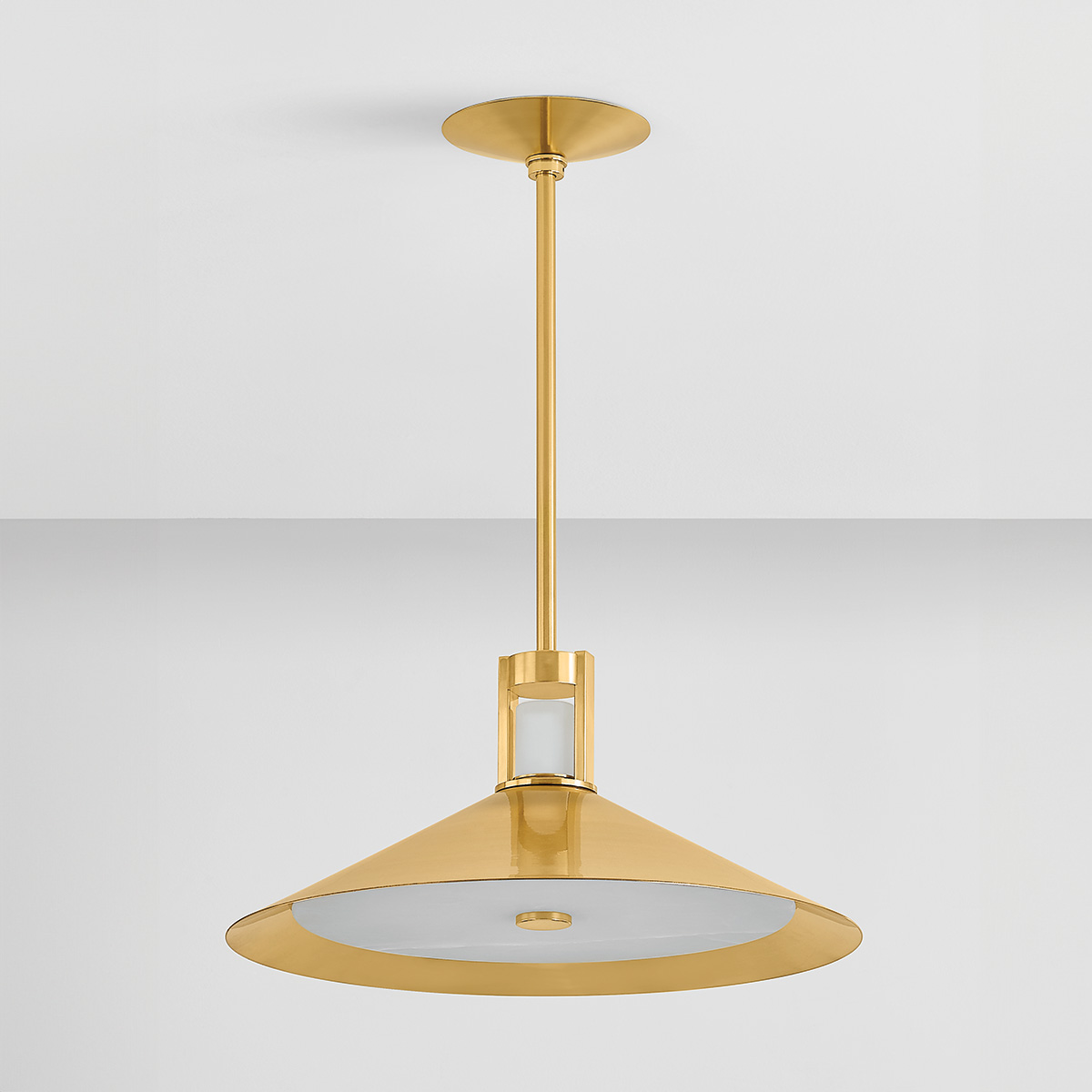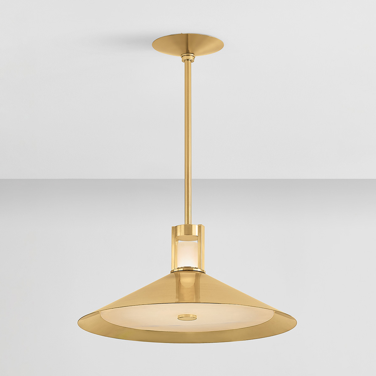 A luxurious basic for modern homes, Clermont features a sharply tapered conical shade and energy-efficient LED technology. When illuminated, the light washes over both the flat alabaster diffuser as well as the clerestory, flooding your living space with a soft glow. Available in two sizes and two finishes, Aged Brass and Distressed Bronze.