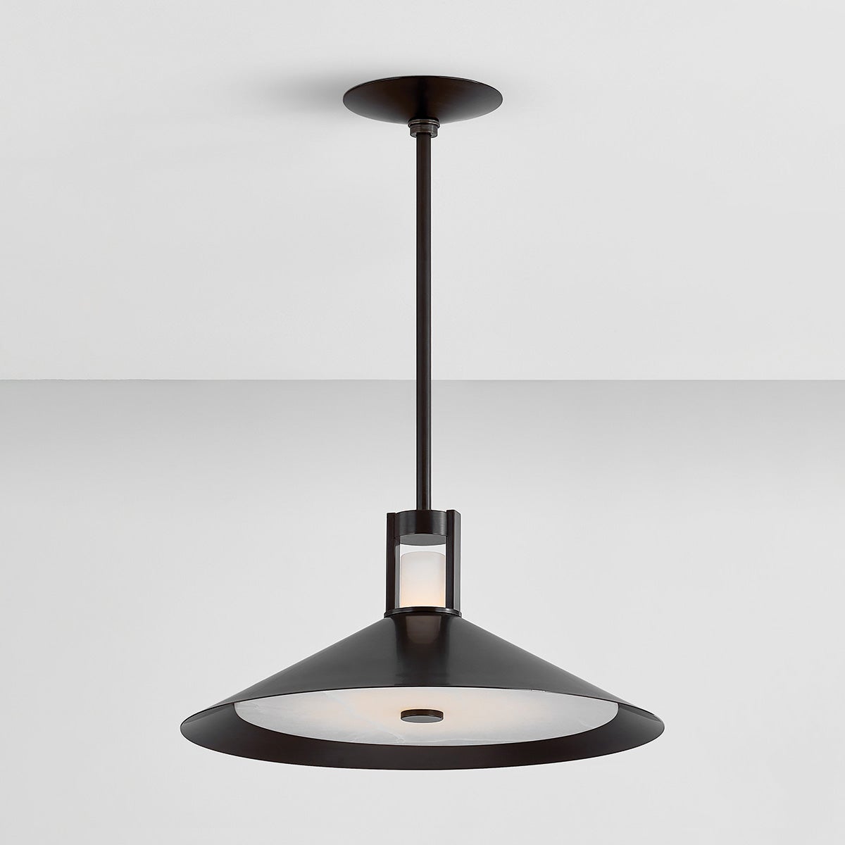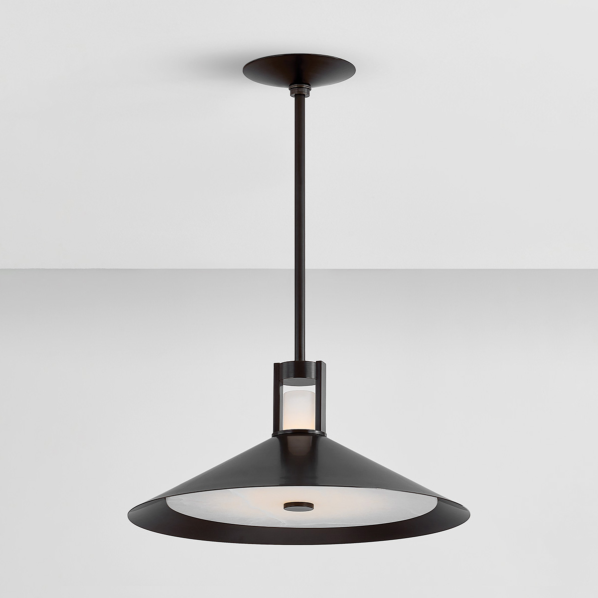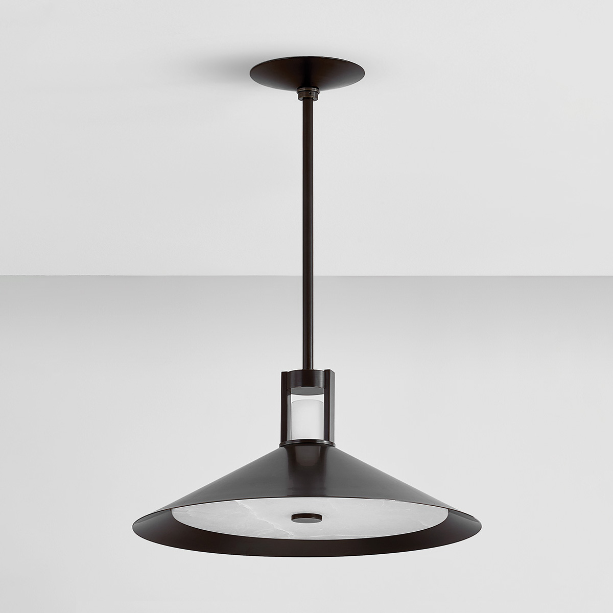A luxurious basic for modern homes, Clermont features a sharply tapered conical shade and energy-efficient LED technology. When illuminated, the light washes over both the flat alabaster diffuser as well as the clerestory, flooding your living space with a soft glow. Available in two sizes and two finishes, Aged Brass and Distressed Bronze.