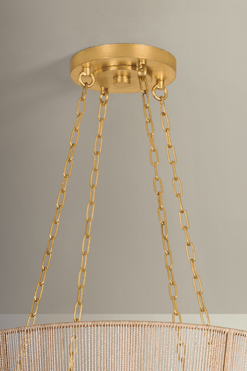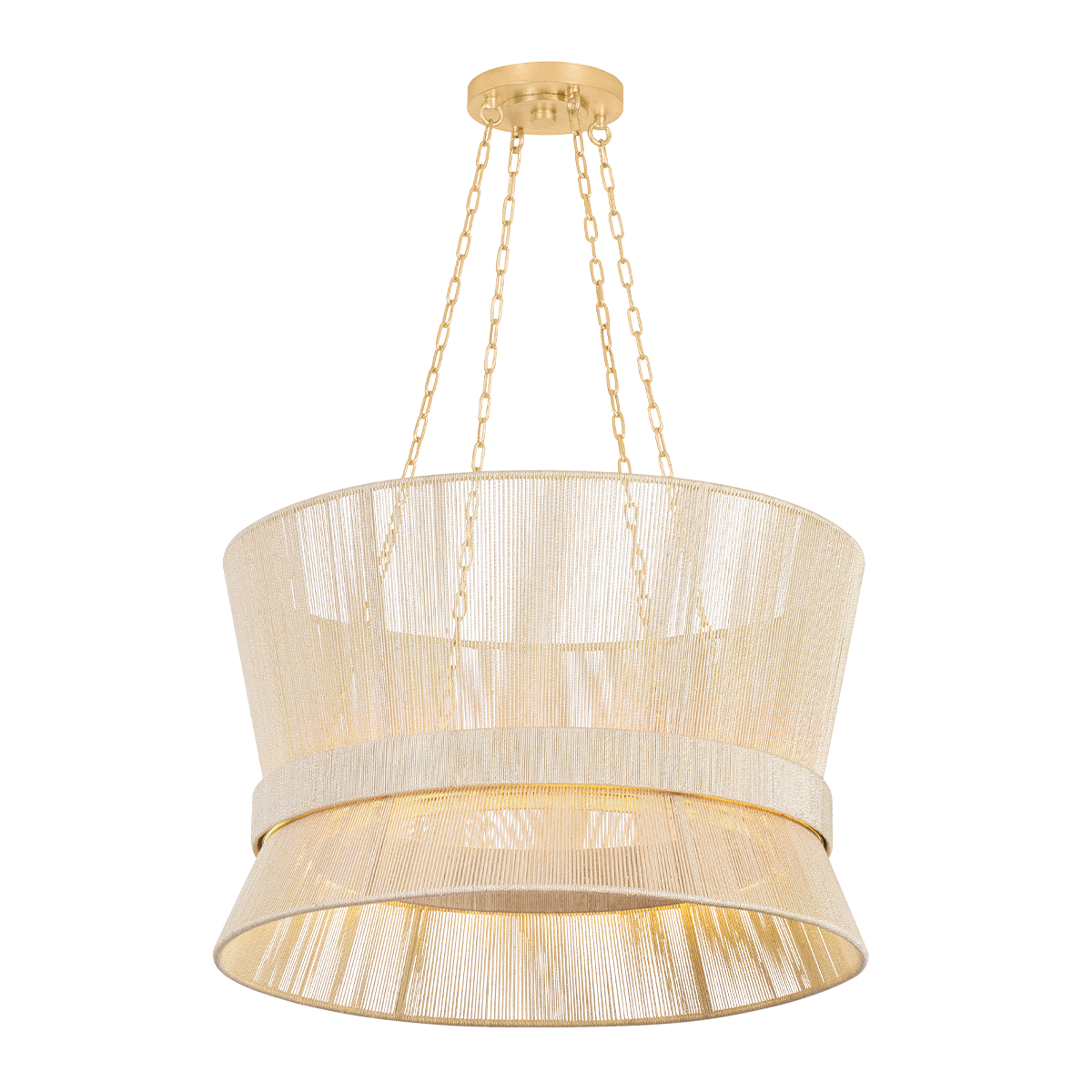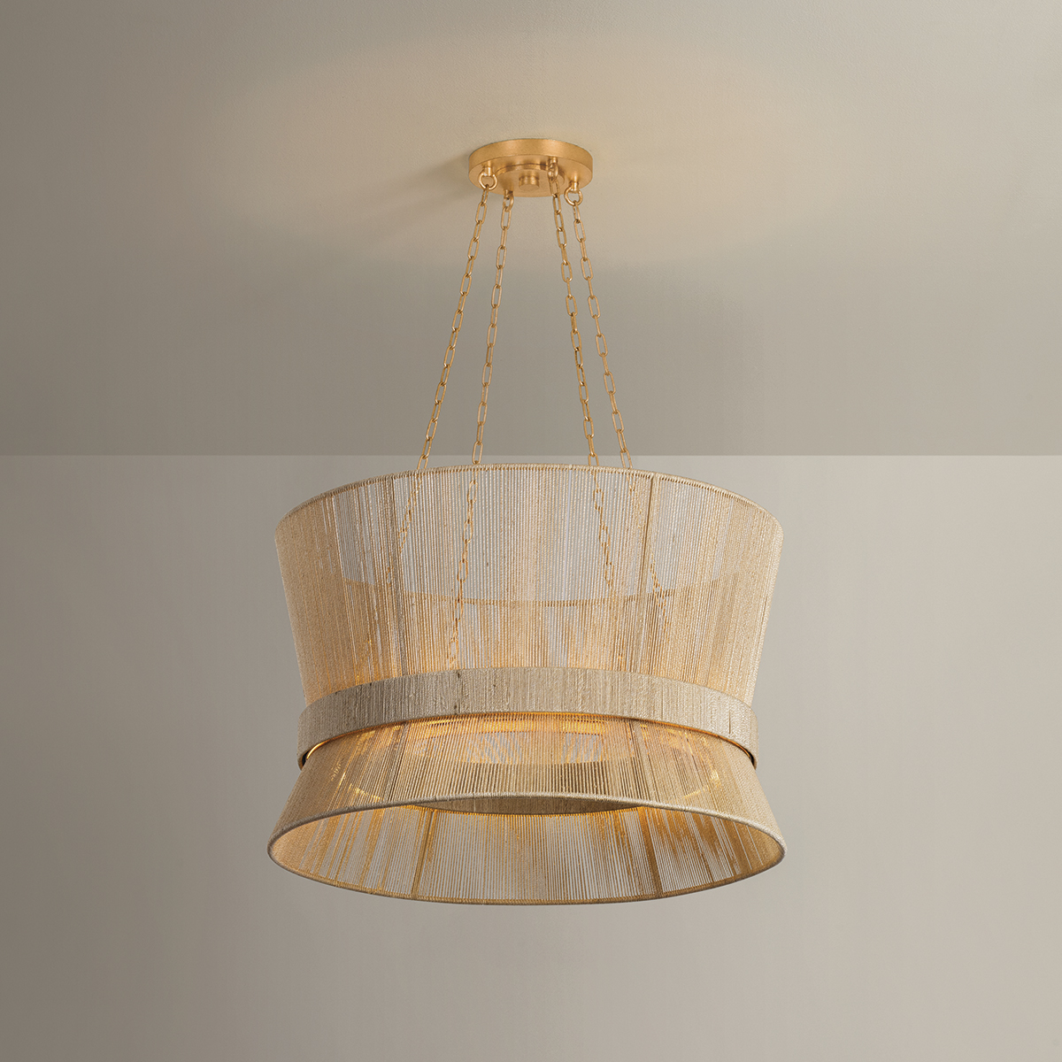 Channeling traditional basketry, the shade of the Ocean Hill pendant is handwoven from fine abaca. A belt of matching string wraps around the center, accentuating the hourglass shape of the fixture. LED light filters through the dense weave to create an inviting glow. Suspended by four chains finished in Vintage Gold Leaf, Ocean Hill is the perfect reminder of how exciting modern craftsmanship can be.