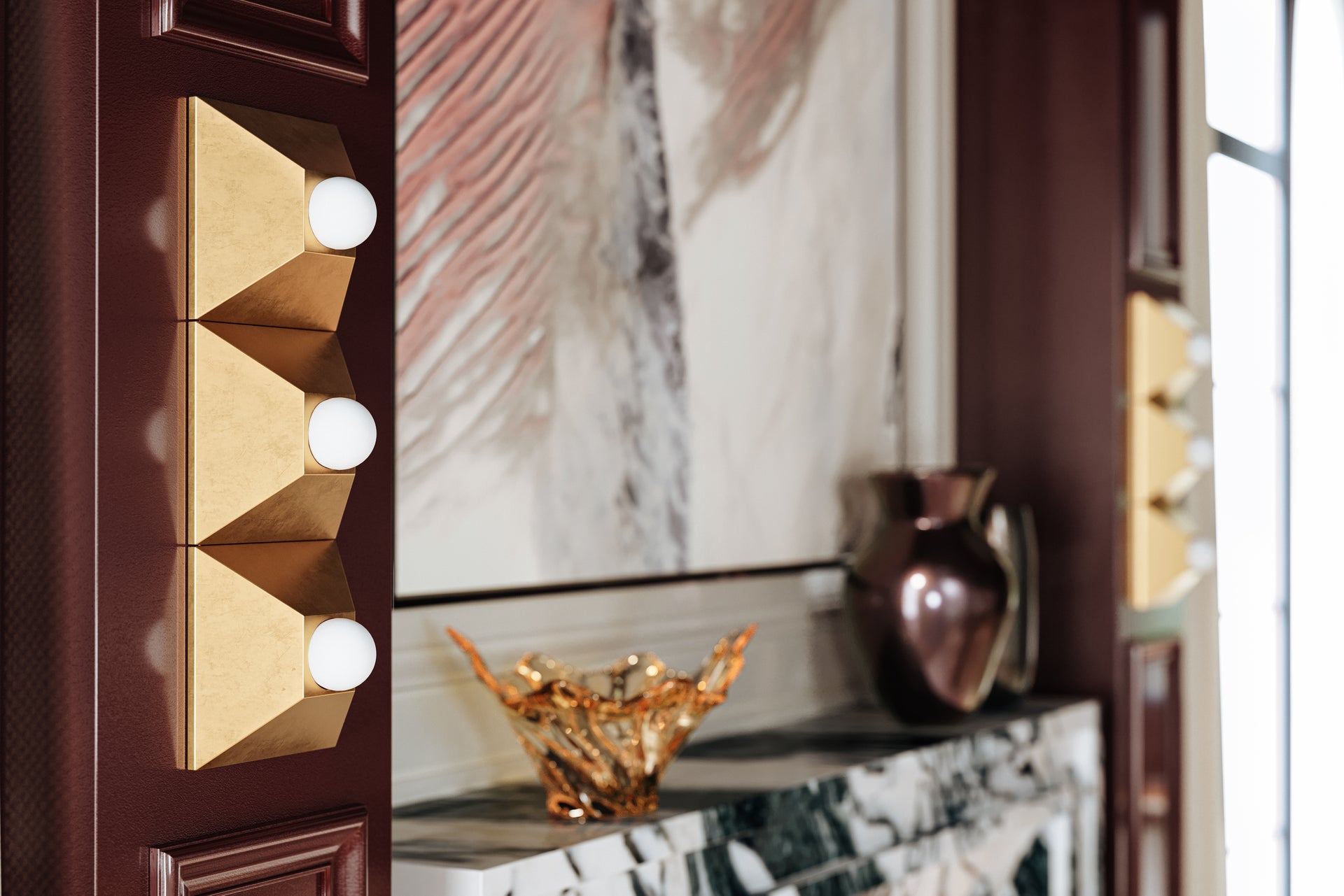 Playing with shapes, Max gives simple geometry maximum style. A series of pyramid bases supporting round globe lights come together to form squares and rectangles. The vintage gold or silver leaf finishes add to the design's overall Hollywood glam feeling. Whether in a flush mount, sconce or bath and vanity, Max adds a chic vibe to any space.