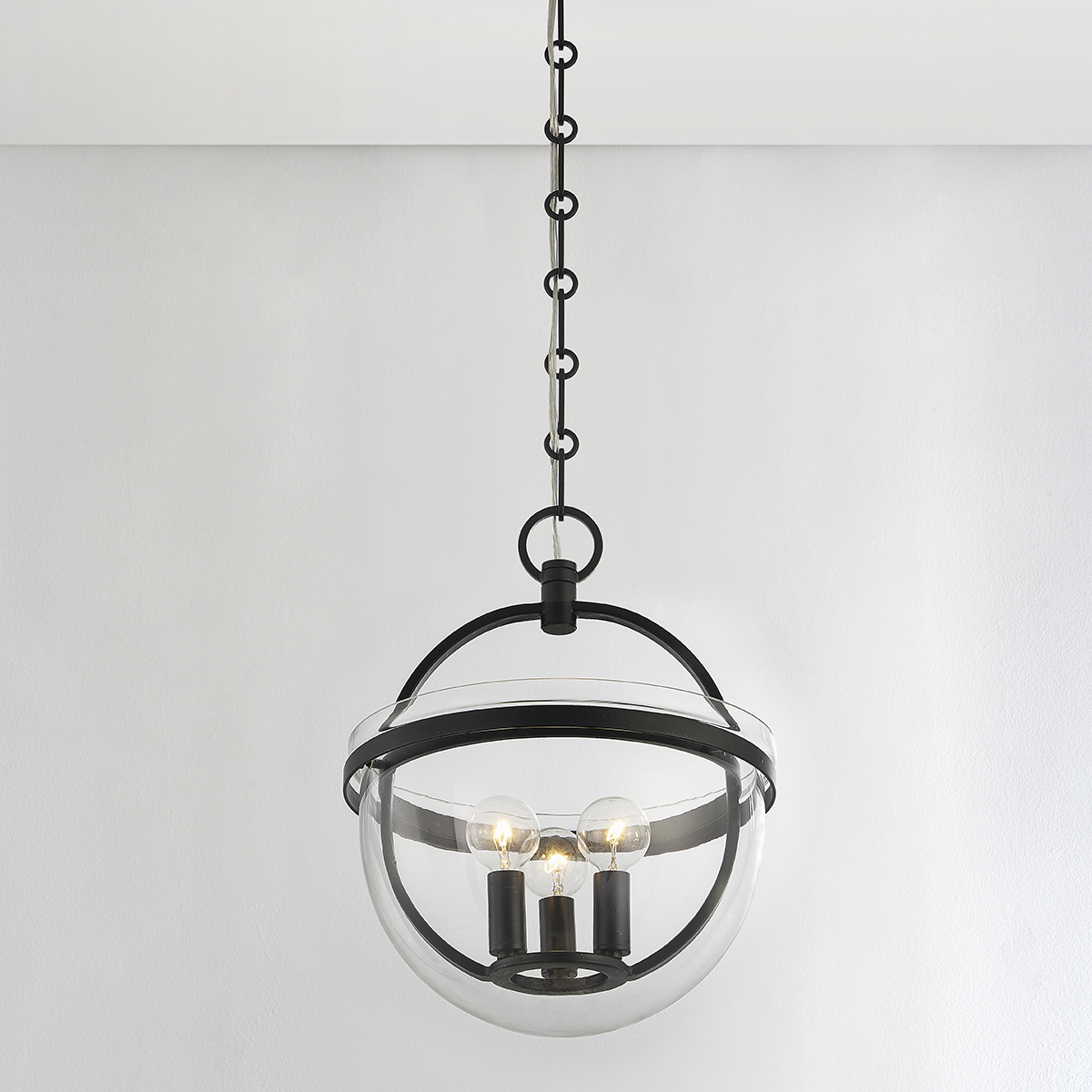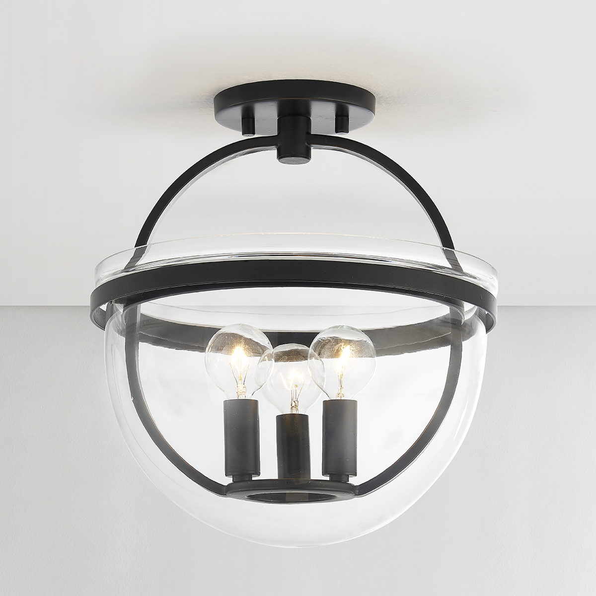 Malloy brings a chic, modern update to the traditional bell jar. An elongated semi-circular clear glass shade partially encloses an elliptical metal framework of Aged Iron or Vintage Gold Leaf. A matching metal band along the top of the glass holds the elements in place with screw details set on the interior band.