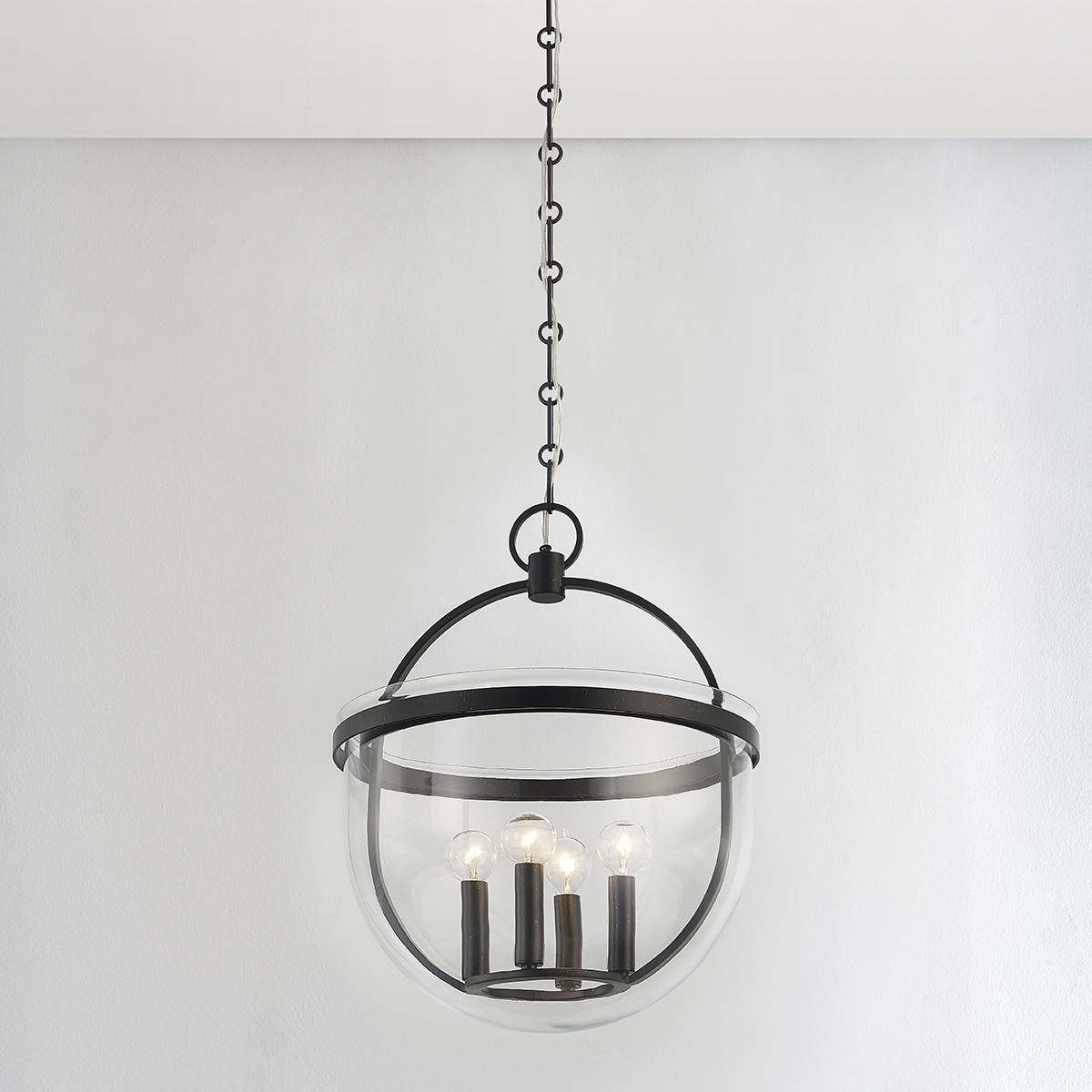 Malloy brings a chic, modern update to the traditional bell jar. An elongated semi-circular clear glass shade partially encloses an elliptical metal framework of Aged Iron or Vintage Gold Leaf. A matching metal band along the top of the glass holds the elements in place with screw details set on the interior band.